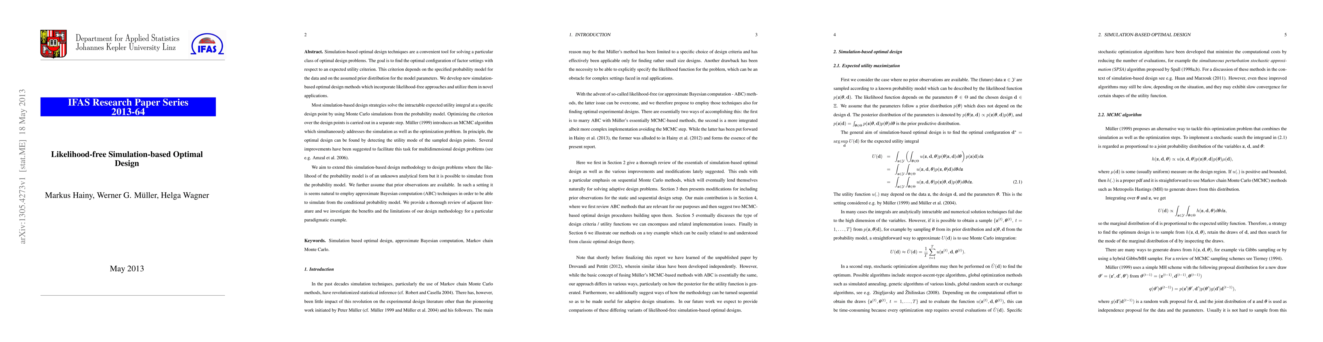Simulation-based optimal design techniques are a convenient tool for solving a particular class of optimal design problems. The goal is to find the optimal configuration of factor settings with respect to an expected utility criterion. This criterion depends on the specified probability model for the data and on the assumed prior distribution for the model parameters. We develop new simulation-based optimal design methods which incorporate likelihood-free approaches and utilize them in novel applications. Most simulation-based design strategies solve the intractable expected utility integral at a specific design point by using Monte Carlo simulations from the probability model. Optimizing the criterion over the design points is carried out in a separate step. M\"uller (1999) introduces an MCMC algorithm which simultaneously addresses the simulation as well as the optimization problem. In principle, the optimal design can be found by detecting the utility mode of the sampled design points. Several improvements have been suggested to facilitate this task for multidimensional design problems (see e.g. Amzal et al. 2006). We aim to extend this simulation-based design methodology to design problems where the likelihood of the probability model is of an unknown analytical form but it is possible to simulate from the probability model. We further assume that prior observations are available. In such a setting it is seems natural to employ approximate Bayesian computation (ABC) techniques in order to be able to simulate from the conditional probability model. We provide a thorough review of adjacent literature and we investigate the benefits and the limitations of our design methodology for a particular paradigmatic example.