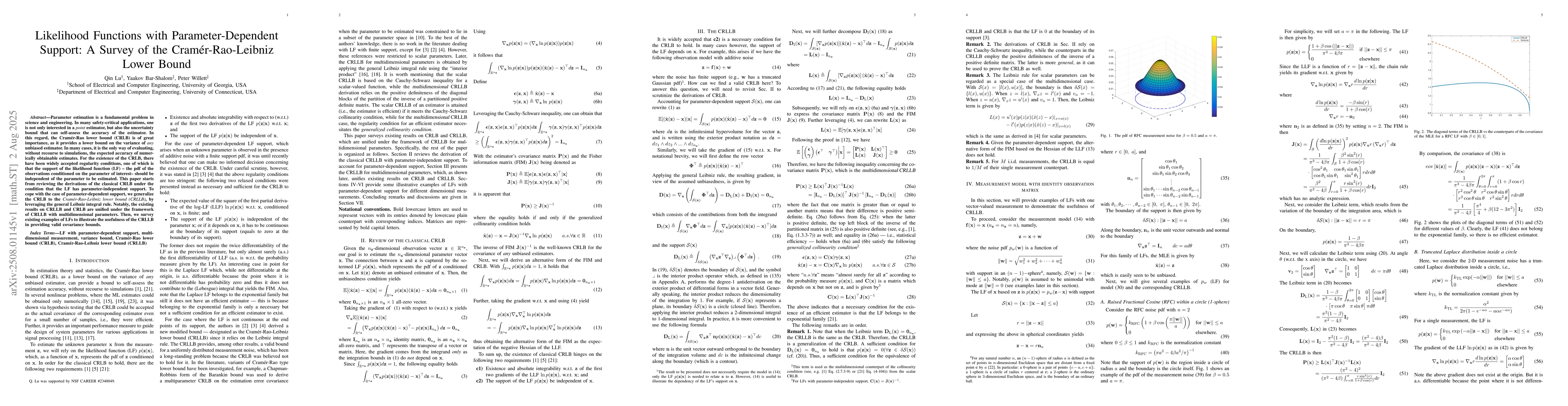 Parameter estimation is a fundamental problem in science and engineering. In many safety-critical applications, one is not only interested in a {\it point} estimator, but also the uncertainty bound that can self-assess the accuracy of the estimator. In this regard, the Cram\'{e}r-Rao lower bound (CRLB) is of great importance, as it provides a lower bound on the variance of {\it any} unbiased estimator. In many cases, it is the only way of evaluating, without recourse to simulations, the expected accuracy of numerically obtainable estimates. For the existence of the CRLB, there have been widely accepted regularity conditions, one of which is that the support of the likelihood function (LF) -- the pdf of the observations conditioned on the parameter of interest -- should be independent of the parameter to be estimated. This paper starts from reviewing the derivations of the classical CRLB under the condition that the LF has parameter-independent support. To cope with the case of parameter-dependent support, we generalize the CRLB to the {\it Cram\'{e}r-Rao-Leibniz lower bound (CRLLB)}, by leveraging the general Leibniz integral rule. Notably, the existing results on CRLLB and CRLB are unified under the framework of CRLLB with multidimensional parameters. Then, we survey existing examples of LFs to illustrate the usefulness of the CRLLB in providing valid covariance bounds.