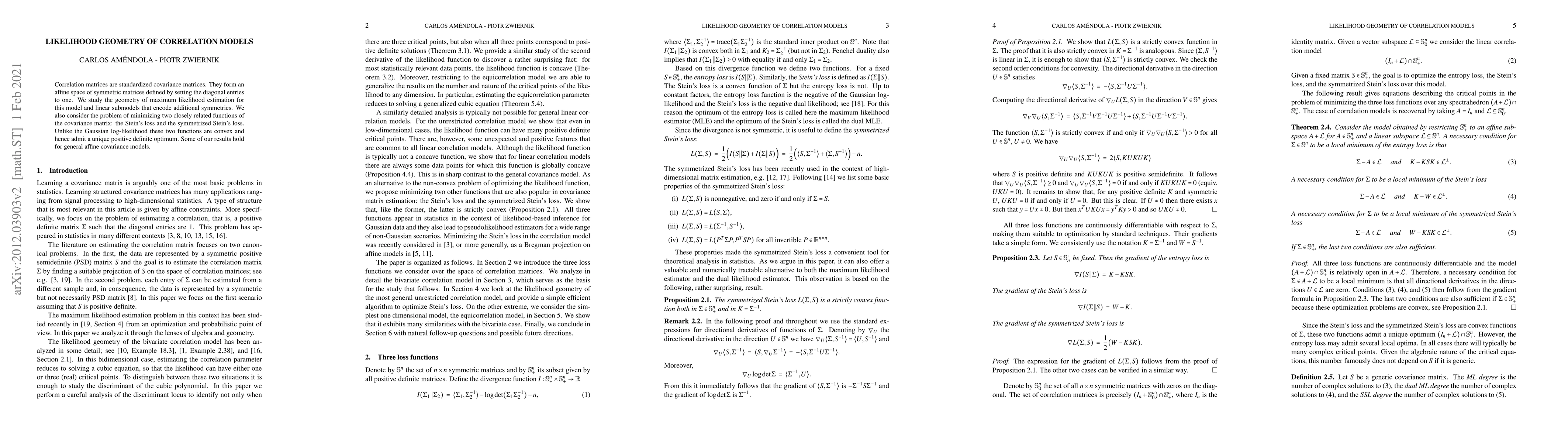 Correlation matrices are standardized covariance matrices. They form an affine space of symmetric matrices defined by setting the diagonal entries to one. We study the geometry of maximum likelihood estimation for this model and linear submodels that encode additional symmetries. We also consider the problem of minimizing two closely related functions of the covariance matrix: the Stein's loss and the symmetrized Stein's loss. Unlike the Gaussian log-likelihood these two functions are convex and hence admit a unique positive definite optimum. Some of our results hold for general affine covariance models.