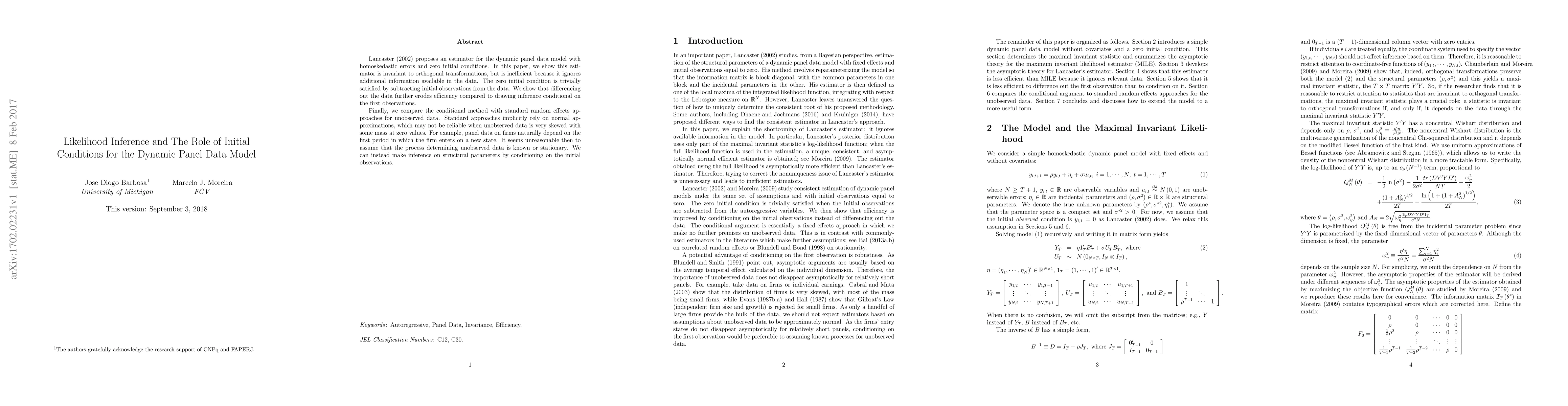 Lancaster (2002} proposes an estimator for the dynamic panel data model with homoskedastic errors and zero initial conditions. In this paper, we show this estimator is invariant to orthogonal transformations, but is inefficient because it ignores additional information available in the data. The zero initial condition is trivially satisfied by subtracting initial observations from the data. We show that differencing out the data further erodes efficiency compared to drawing inference conditional on the first observations. Finally, we compare the conditional method with standard random effects approaches for unobserved data. Standard approaches implicitly rely on normal approximations, which may not be reliable when unobserved data is very skewed with some mass at zero values. For example, panel data on firms naturally depend on the first period in which the firm enters on a new state. It seems unreasonable then to assume that the process determining unobserved data is known or stationary. We can instead make inference on structural parameters by conditioning on the initial observations.