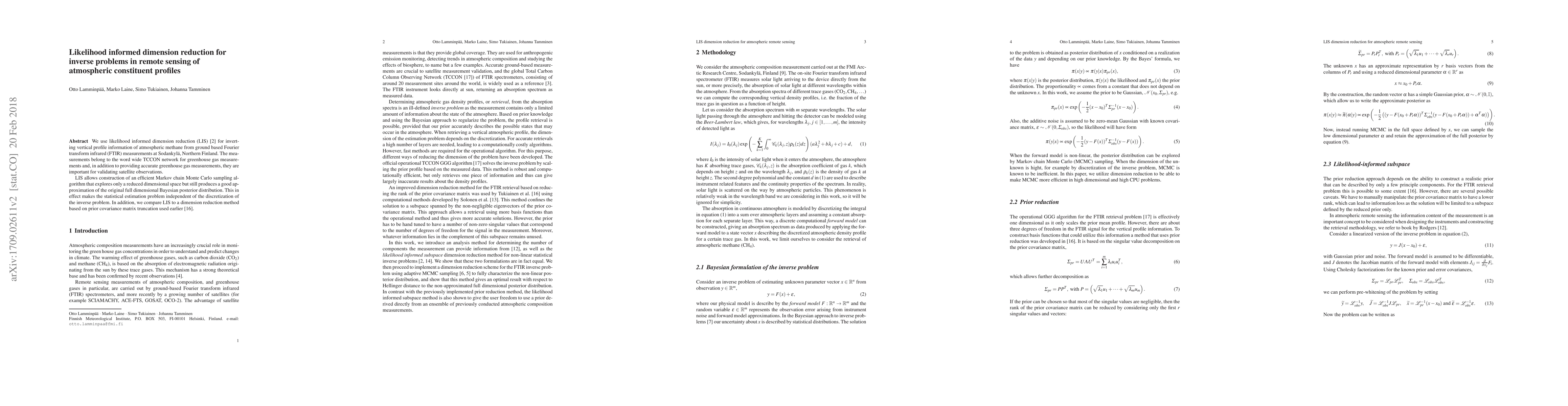 We use likelihood informed dimension reduction (LIS) (T. Cui et al. 2014) for inverting vertical profile information of atmospheric methane from ground based Fourier transform infrared (FTIR) measurements at Sodankyl\"a, Northern Finland. The measurements belong to the word wide TCCON network for greenhouse gas measurements and, in addition to providing accurate greenhouse gas measurements, they are important for validating satellite observations. LIS allows construction of an efficient Markov chain Monte Carlo sampling algorithm that explores only a reduced dimensional space but still produces a good approximation of the original full dimensional Bayesian posterior distribution. This in effect makes the statistical estimation problem independent of the discretization of the inverse problem. In addition, we compare LIS to a dimension reduction method based on prior covariance matrix truncation used earlier (S. Tukiainen et al. 2016).