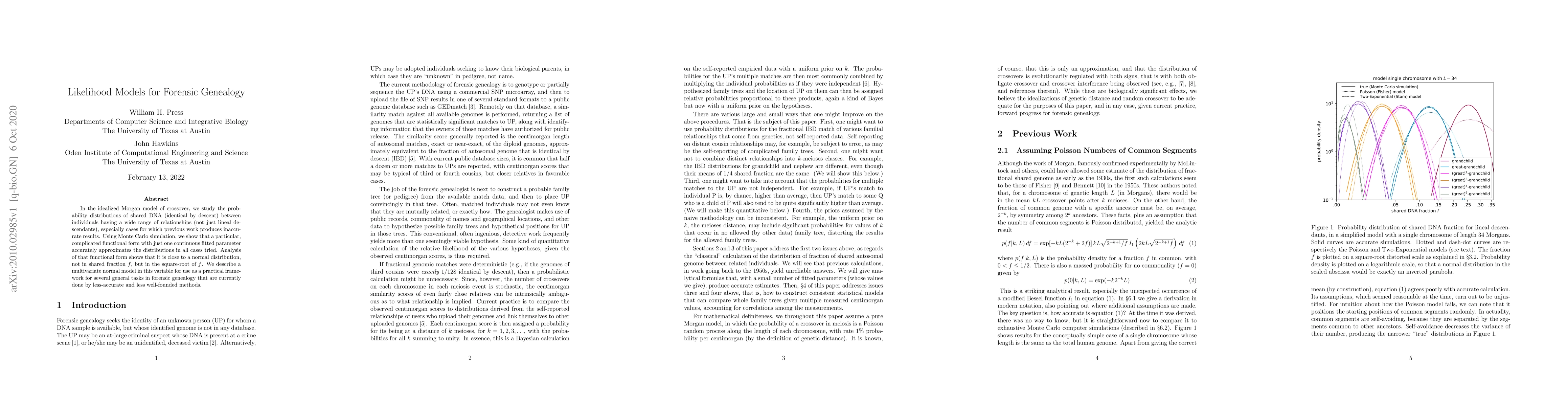 In the idealized Morgan model of crossover, we study the probability distributions of shared DNA (identical by descent) between individuals having a wide range of relationships (not just lineal descendants), especially cases for which previous work produces inaccurate results. Using Monte Carlo simulation, we show that a particular, complicated functional form with just one continuous fitted parameter accurately approximates the distributions in all cases tried. Analysis of that functional form shows that it is close to a normal distribution, not in shared fraction f, but in the square-root of f. We describe a multivariate normal model in this variable for use as a practical framework for several general tasks in forensic genealogy that are currently done by less-accurate and less well-founded methods.