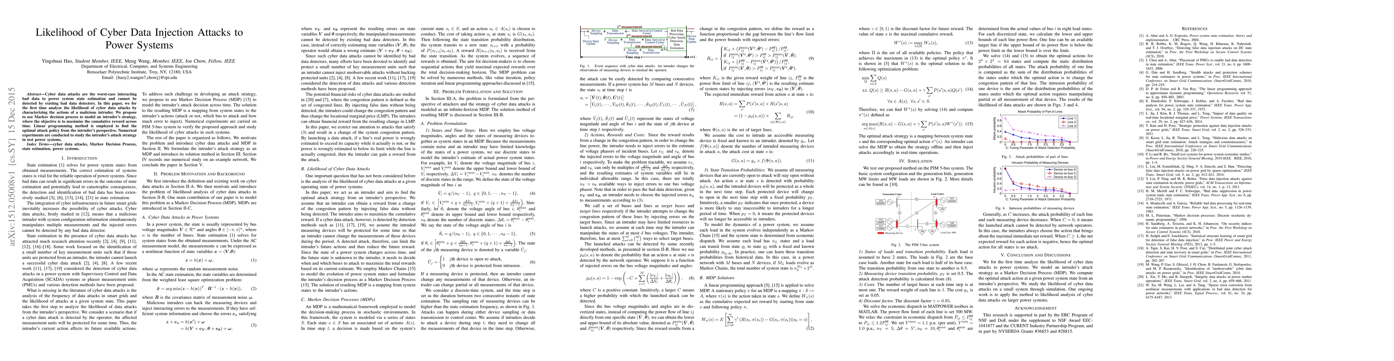 This paper analyzes the likelihood of cyber data injection attacks on power systems, modeling the intruder's strategy using a Markov decision process to maximize cumulative rewards. Linear programming is employed to determine the optimal attack policy, and numerical experiments are conducted to evaluate this strategy in test power systems.