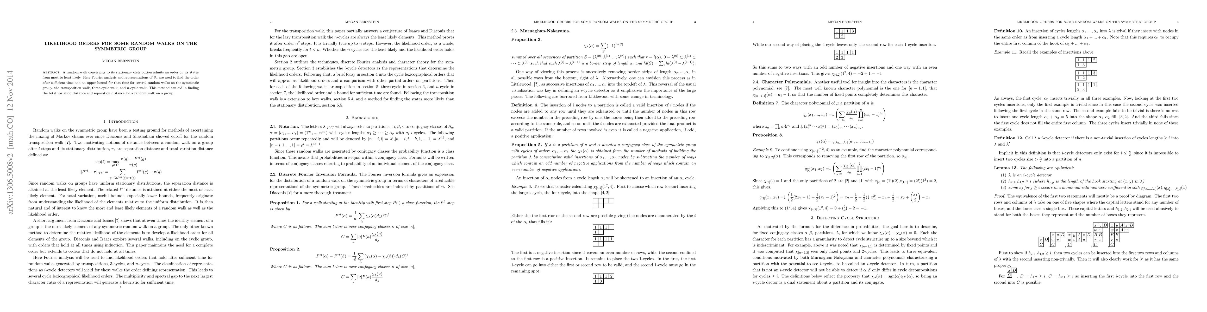 Several cycle lexicographical orders are found to describe the relative likelihood of elements of the random walks on the symmetric group generated by the conjugacy classes of transpositions, 3-cycles, and n-cycles. Spectral analysis finds sufficient time for the orders to hold. This partially answers a conjecture that the n-cycles are the least likely elements of the transposition walk on the symmetric group. A likelihood order contributes to understanding the total variation distance and separation distance for a random walk.