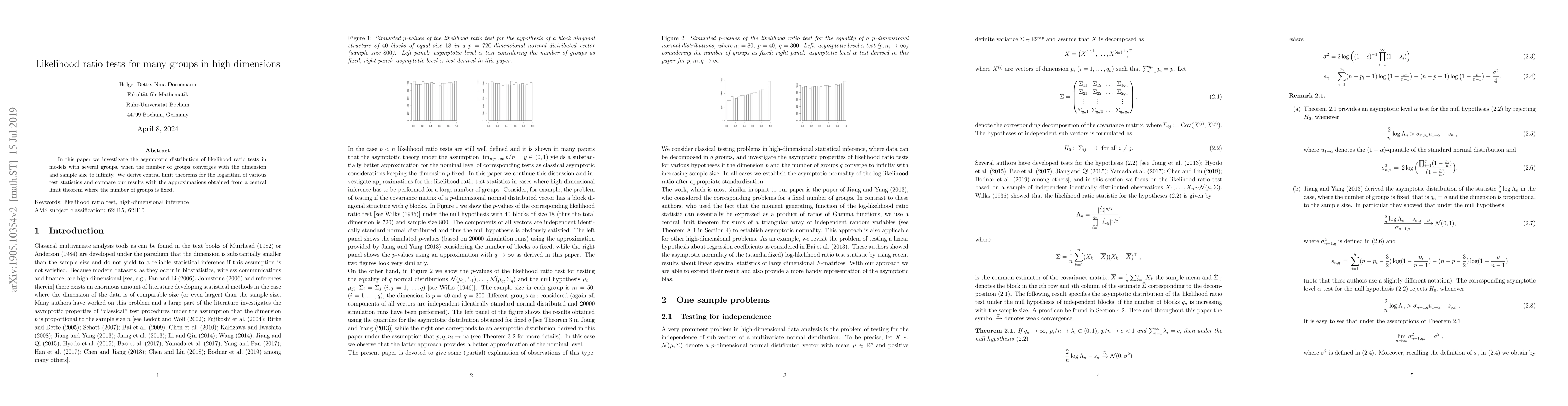 This paper examines the asymptotic distribution of likelihood ratio tests in high-dimensional models with a growing number of groups, deriving central limit theorems for test statistics. It compares these results with approximations from a two-step procedure that first fixes the number of groups before allowing the dimension and sample size to grow.