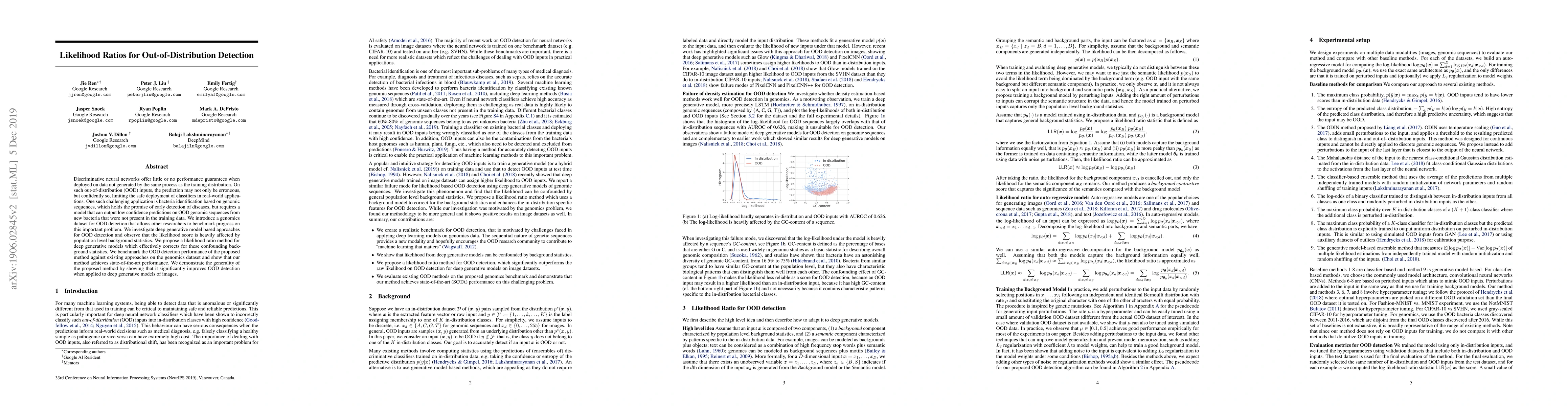 This paper introduces a genomics dataset for out-of-distribution (OOD) detection, focusing on bacteria identification. It proposes a likelihood ratio method using deep generative models to correct background statistics affecting likelihood scores. The method outperforms existing approaches on both genomics and image data, enhancing OOD detection reliability.