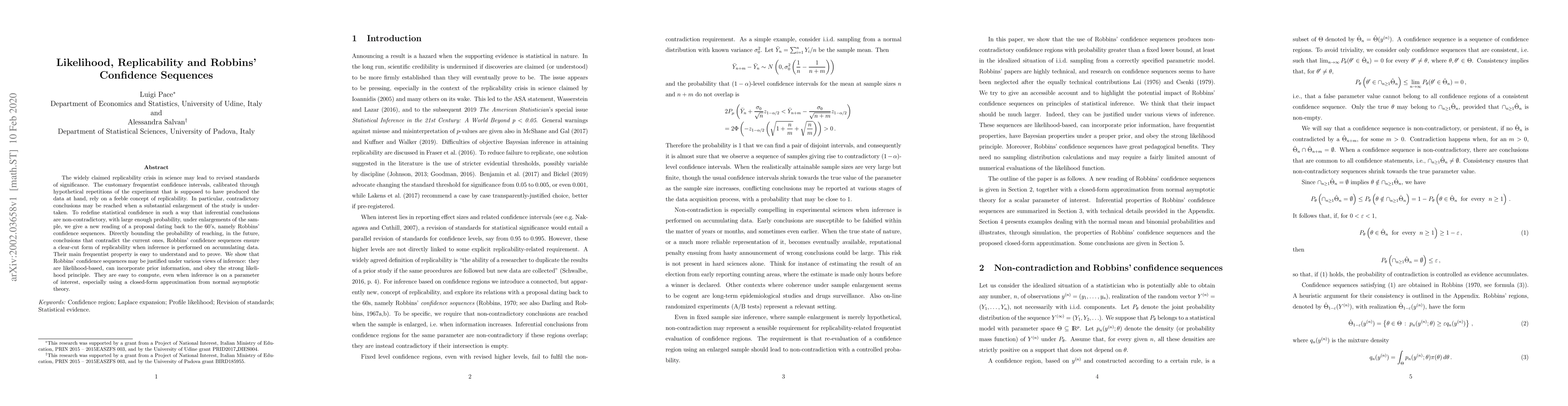 The widely claimed replicability crisis in science may lead to revised standards of significance. The customary frequentist confidence intervals, calibrated through hypothetical repetitions of the experiment that is supposed to have produced the data at hand, rely on a feeble concept of replicability. In particular, contradictory conclusions may be reached when a substantial enlargement of the study is undertaken. To redefine statistical confidence in such a way that inferential conclusions are non-contradictory, with large enough probability, under enlargements of the sample, we give a new reading of a proposal dating back to the 60's, namely Robbins' confidence sequences. Directly bounding the probability of reaching, in the future, conclusions that contradict the current ones, Robbins' confidence sequences ensure a clear-cut form of replicability when inference is performed on accumulating data. Their main frequentist property is easy to understand and to prove. We show that Robbins' confidence sequences may be justified under various views of inference: they are likelihood-based, can incorporate prior information, and obey the strong likelihood principle. They are easy to compute, even when inference is on a parameter of interest, especially using a closed-form approximation from normal asymptotic theory.