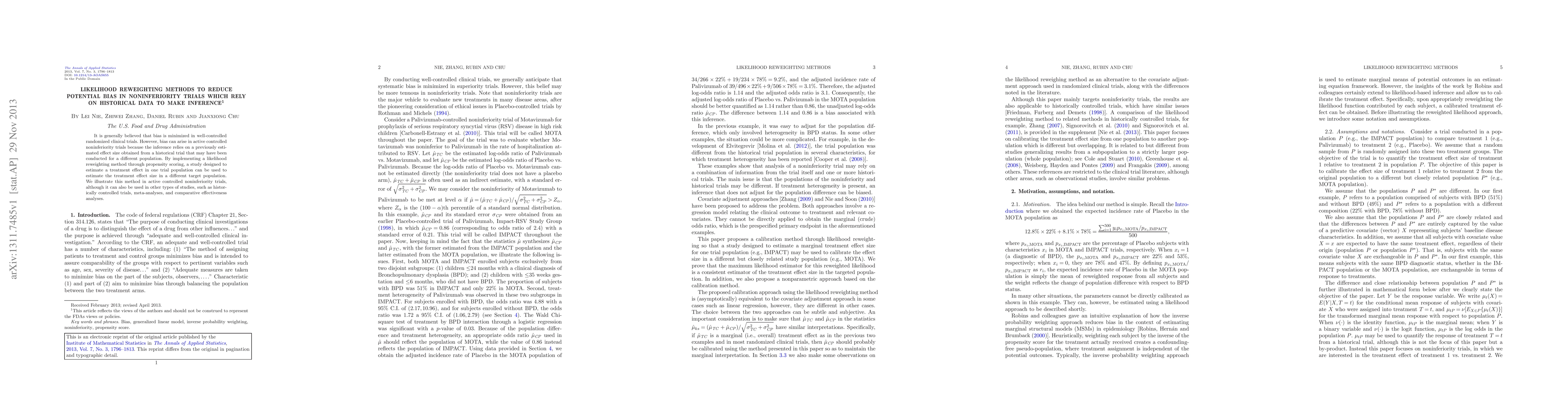This research introduces a likelihood reweighting method using propensity scoring to reduce bias in noninferiority trials. The method allows estimation of treatment effects across different trial populations, applicable beyond active-controlled trials to other study types like historically controlled trials and meta-analyses.