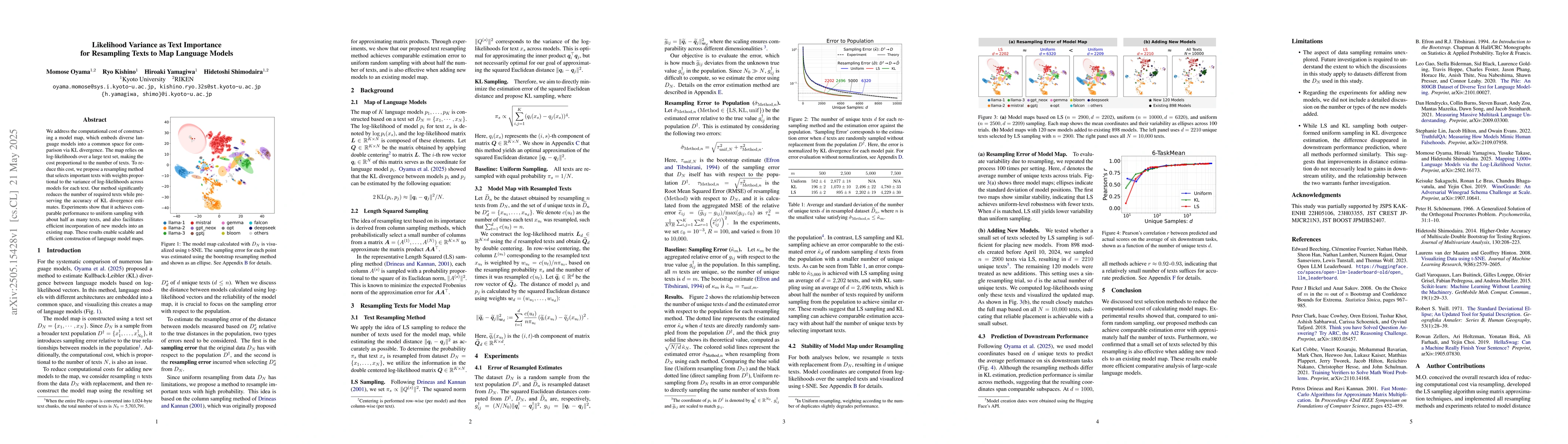 A new method reduces computational cost of mapping language models by selecting important texts based on log-likelihood variance, achieving comparable performance with half the required texts.
