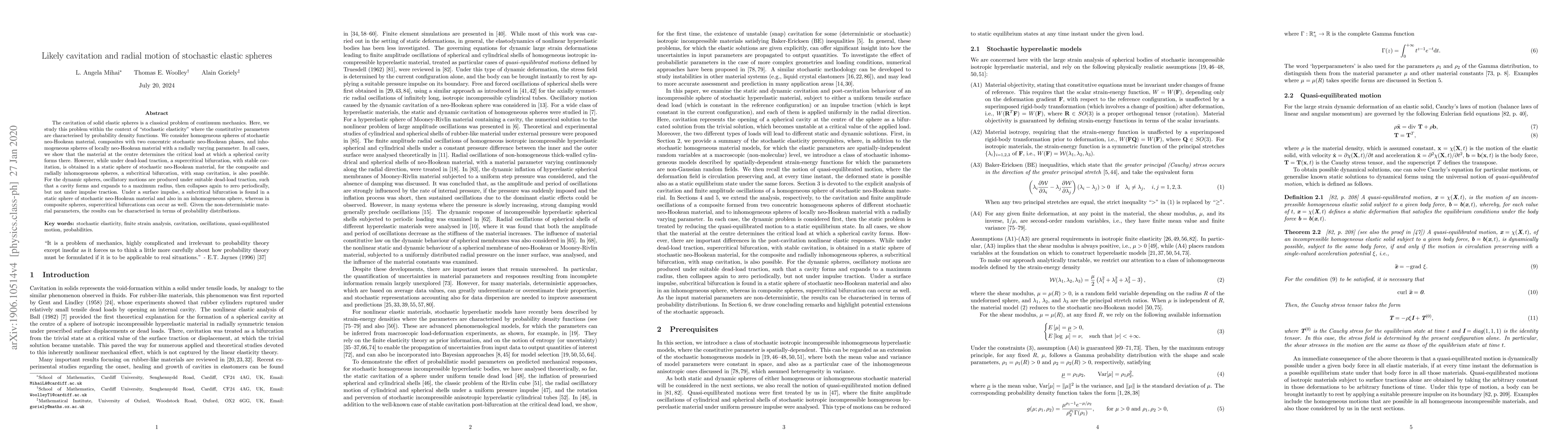 This paper investigates cavitation in stochastic elastic spheres under various loading conditions, showing that the material's central properties determine critical load for cavity formation. It finds that while static spheres may undergo stable cavitation, composite and inhomogeneous spheres can experience snap cavitation, and dynamic spheres exhibit oscillatory cavity expansion and collapse.