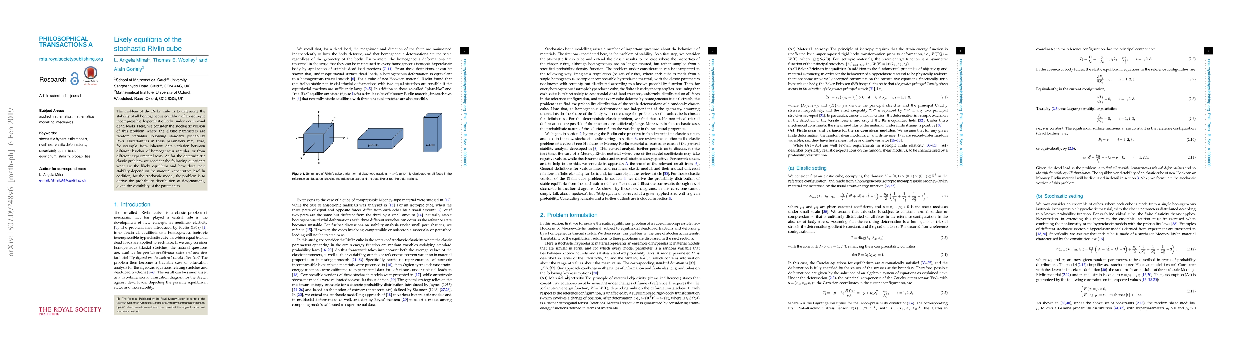 This paper investigates the stochastic Rivlin cube problem, focusing on the stability of homogeneous equilibria in an isotropic incompressible hyperelastic body under equitriaxial loads, where elastic parameters are random variables. It aims to determine the likely equilibria and their stability, as well as the probability distribution of deformations due to parameter variability.