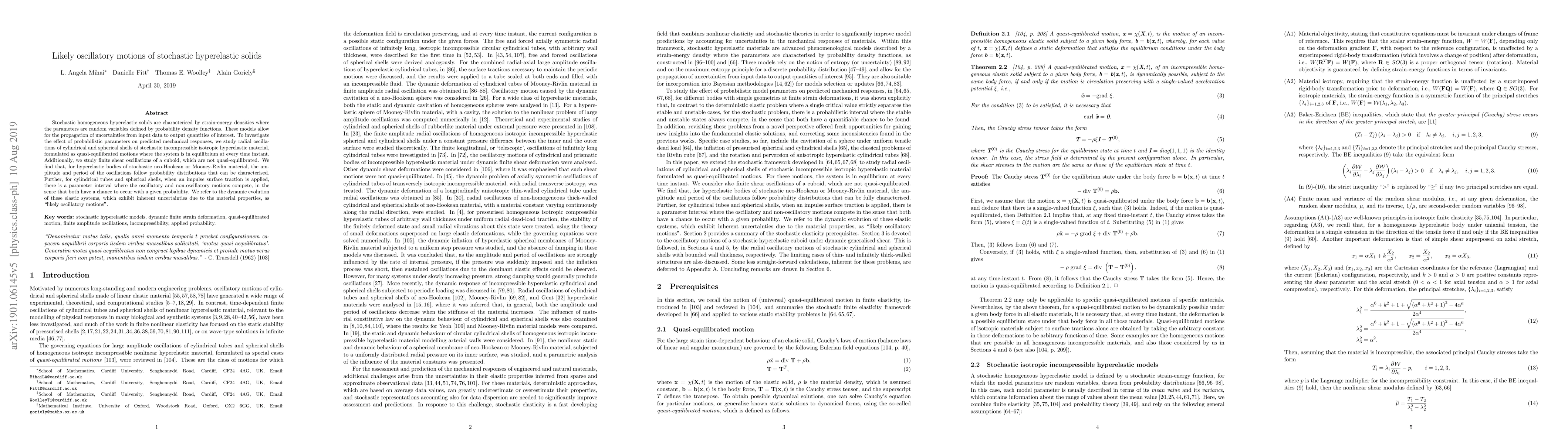 This paper investigates the oscillatory behaviors of stochastic hyperelastic solids under various loading conditions, finding that their amplitude and period follow specific probability distributions. It reveals a parameter interval where oscillatory and non-oscillatory motions coexist, termed 'likely oscillatory motions' due to inherent material uncertainties.