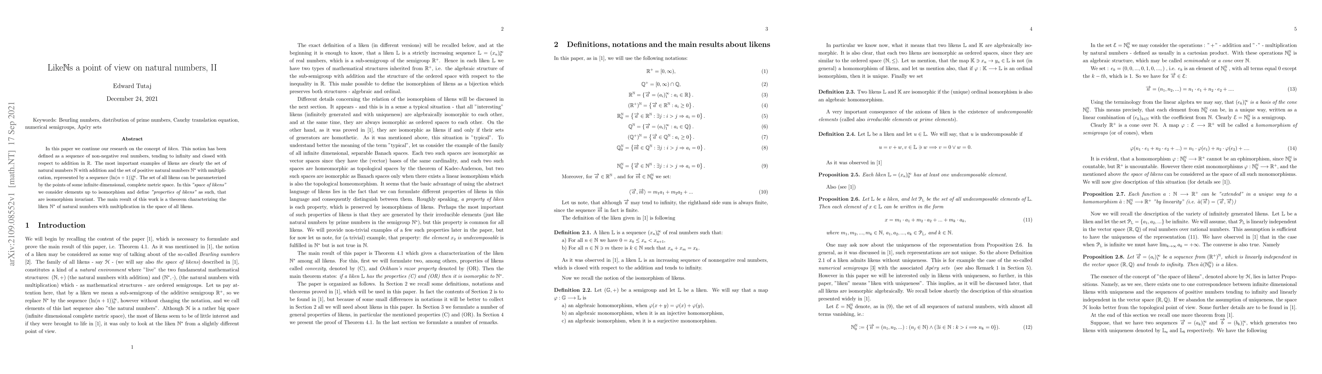 In this paper we continue our research on the concept of liken. This notion has been defined as a sequence of non-negative real numbers, tending to infinity and closed with respect to addition in $\mathbb{R}$. The most important examples of likens are clearly the set of natural numbers $\mathbb{N}$ with addition and the set of positive natural numbers $\mathbb{N}^{*}$ with multiplication, represented by a sequence $(\ln({n+1}))_0^{\infty}$. The set of all likens can be parameterized by the points of some infinite dimensional, complete metric space. In this space of likens we consider elements up to isomorphism and define properties of likens as such, that are isomorphism invariant. The main result of this work is a theorem characterizing the liken ${\mathbb N}^*$ of natural numbers with multiplication in the space of all likens.