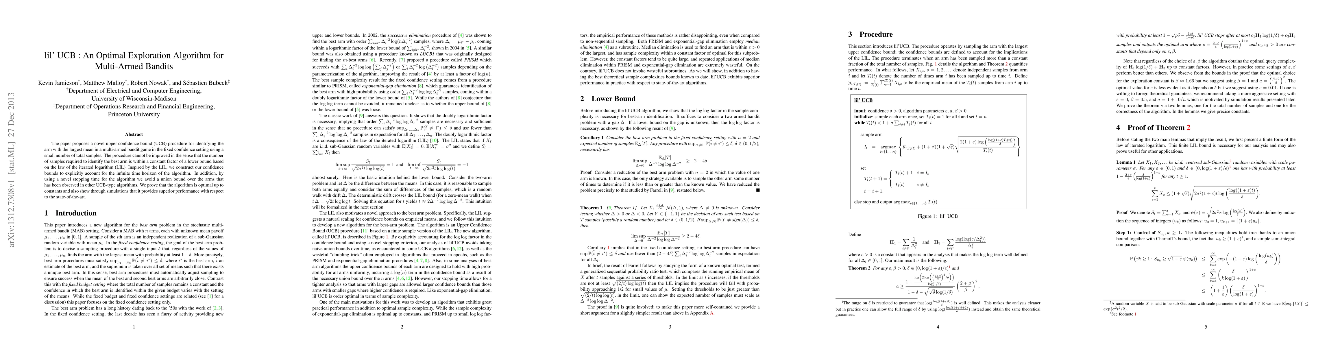 The paper introduces lil' UCB, a novel optimal exploration algorithm for multi-armed bandit problems, which minimizes the number of samples needed to identify the best arm, proving its optimality and demonstrating superior performance through simulations. The algorithm leverages the law of the iterated logarithm and a unique stopping time to avoid traditional union bounds.
