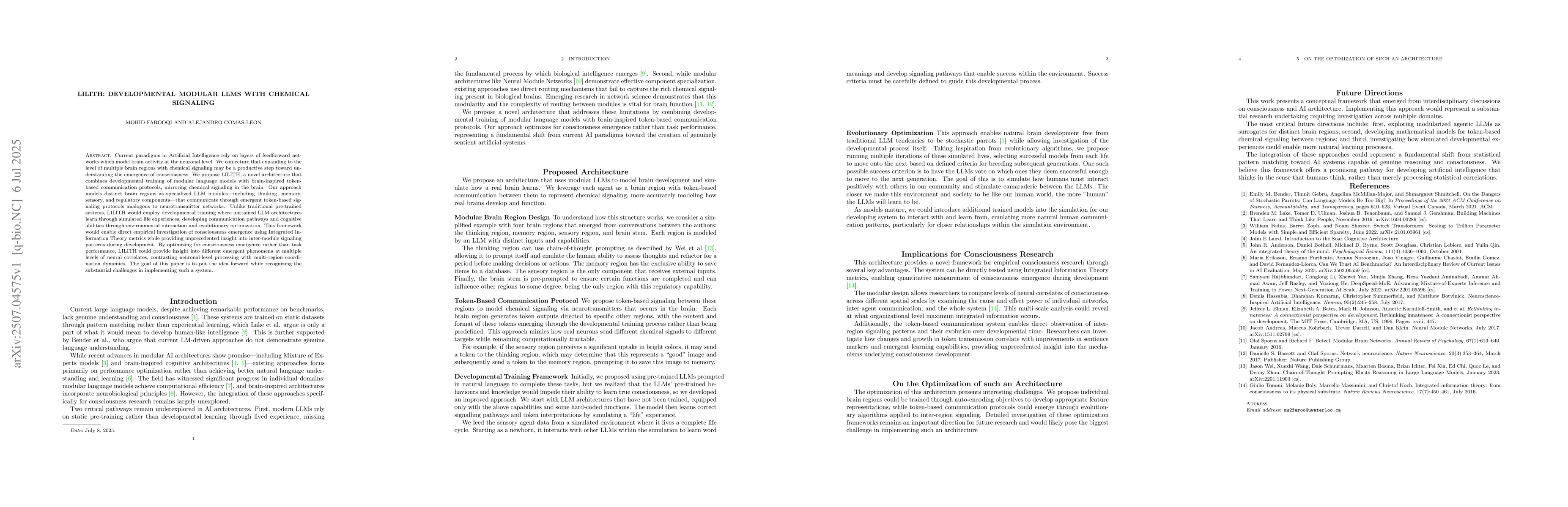Current paradigms in Artificial Intelligence rely on layers of feedforward networks which model brain activity at the neuronal level. We conjecture that expanding to the level of multiple brain regions with chemical signaling may be a productive step toward understanding the emergence of consciousness. We propose LILITH, a novel architecture that combines developmental training of modular language models with brain-inspired token-based communication protocols, mirroring chemical signaling in the brain. Our approach models distinct brain regions as specialized LLM modules including thinking, memory, sensory, and regulatory components that communicate through emergent token-based signaling protocols analogous to neurotransmitter networks. Unlike traditional pre-trained systems, LILITH would employ developmental training where untrained LLM architectures learn through simulated life experiences, developing communication pathways and cognitive abilities through environmental interaction and evolutionary optimization. This framework would enable direct empirical investigation of consciousness emergence using Integrated Information Theory metrics while providing unprecedented insight into inter-module signaling patterns during development. By optimizing for consciousness emergence rather than task performance, LILITH could provide insight into different emergent phenomena at multiple levels of neural correlates, contrasting neuronal-level processing with multi-region coordination dynamics. The goal of this paper is to put the idea forward while recognizing the substantial challenges in implementing such a system.