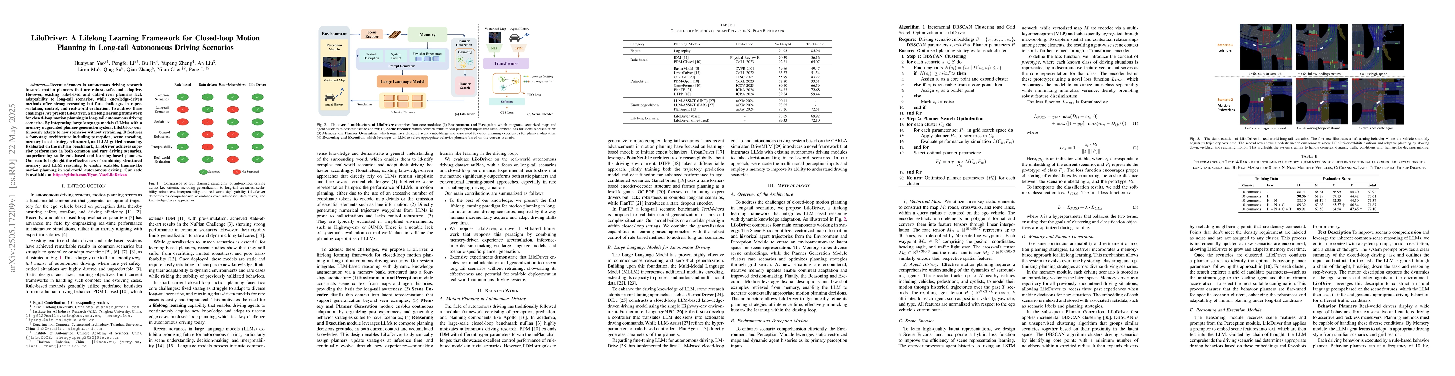 LiloDriver presents a lifelong learning framework for closed-loop motion planning, merging memory-augmented planner generation with large language models for adaptability in long-tail autonomous driving scenarios.