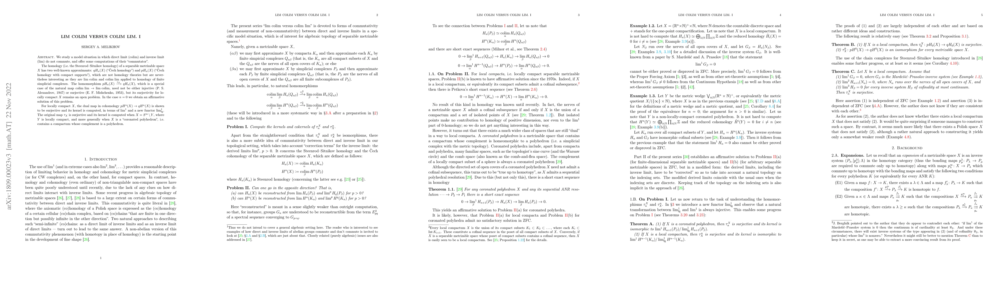 We study a model situation in which direct limit ($\text{colim}$) and inverse limit ($\lim$) do not commute, and offer some computations of their "commutator". The homology of a separable metrizable space $X$ has two well-known approximants: $qH_n(X)$ ("\v{C}ech homology") and $pH_n(X)$ ("\v{C}ech homology with compact supports"), which are not homology theories but are nevertheless interesting as they are $\lim\text{colim}$ and $\text{colim}\lim$ applied to homology of finite simplicial complexes. The homomorphism $\tau_X: pH_n(X)\to qH_n(X)$, which is a special case of the natural map $\text{colim}\lim\to\lim\text{colim}$, need not be either injective (P. S. Alexandrov, 1947) or surjective (E. F. Mishchenko, 1953), but its surjectivity for locally compact $X$ remains an open problem. In the case $n=0$ we obtain an affirmative solution of this problem. For locally compact $X$, the dual map in cohomology $pH^n(X)\to qH^n(X)$ is shown to be surjective and its kernel is computed, in terms of $\lim^1$ and a new functor $\lim^1_{\text{fg}}$. The original map $\tau_X$ is surjective and its kernel is computed when $X$ is a "coronated polyhedron", i.e. contains a compactum whose complement is a polyhedron.