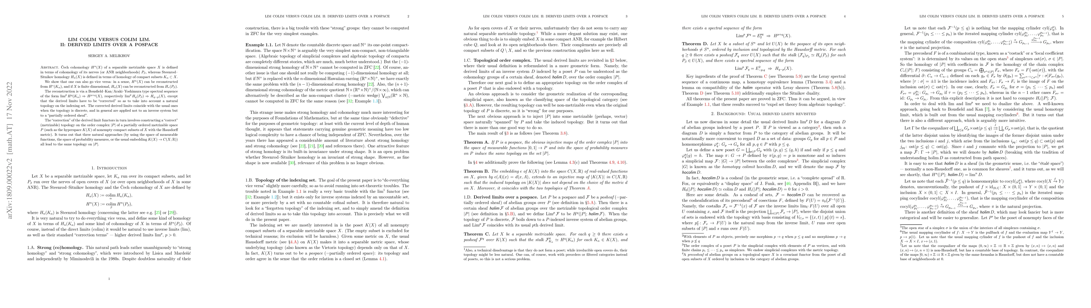 \v{C}ech cohomology $H^n(X)$ of a separable metrizable space $X$ is defined in terms of cohomology of its nerves (or ANR neighborhoods) $P_\beta$ whereas Steenrod-Sitnikov homology $H_n(X)$ is defined in terms of homology of compact subsets $K_\alpha\subset X$. We show that one can also go vice versa: in a sense, $H^n(X)$ can be reconstructed from $H^n(K_\alpha)$, and if $X$ is finite dimensional, $H_n(X)$ can be reconstructed from $H_n(P_\beta)$. The reconstruction is via a Bousfield-Kan/Araki-Yoshimura type spectral sequence, except that the derived limits have to be "corrected" so as to take into account a natural topology on the indexing set. The corrected derived limits coincide with the usual ones when the topology is discrete, and in general are applied not to an inverse system but to a "partially ordered sheaf". The "correction" of the derived limit functors in turn involves constructing a "correct" (metrizable) topology on the order complex $|P|$ of a partially ordered metrizable space $P$ (such as the hyperspace $K(X)$ of nonempty compact subsets of $X$ with the Hausdorff metric). It turns out that three natural approaches (by using the space of measurable functions, the space of probability measures, or the usual embedding $K(X)\to C(X;\mathbb R)$) all lead to the same topology on $|P|$.