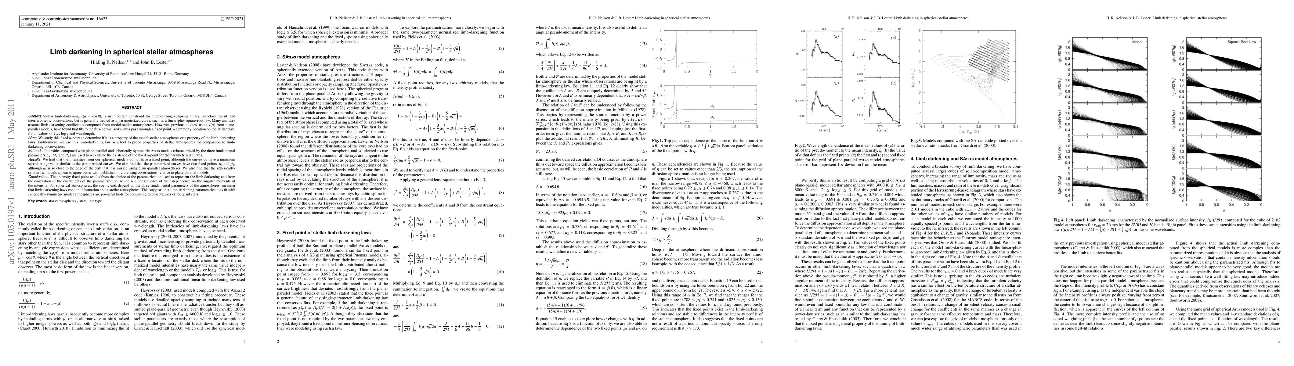 This paper investigates limb darkening in spherical stellar atmospheres, finding that spherical models do not exhibit a fixed point in the parametrized curves, unlike plane-parallel models. It concludes that spherical models better align with microlensing observations and reveals two fixed points in the parametrized curves.