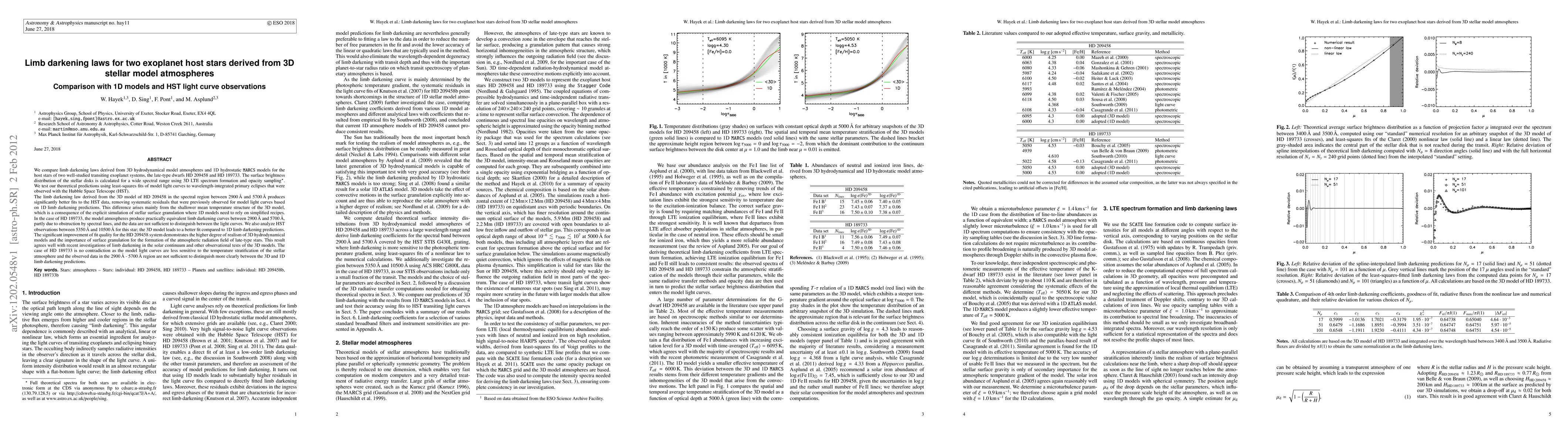 This paper compares limb darkening laws derived from 3D hydrodynamical model atmospheres and 1D hydrostatic MARCS models for the exoplanet host stars HD 209458 and HD 189733. The 3D model for HD 209458 provides significantly better fits to Hubble Space Telescope data, highlighting the importance of surface granulation, while the 3D and 1D models for HD 189733 show similar performance due to spectral line obstructions and insufficient data.