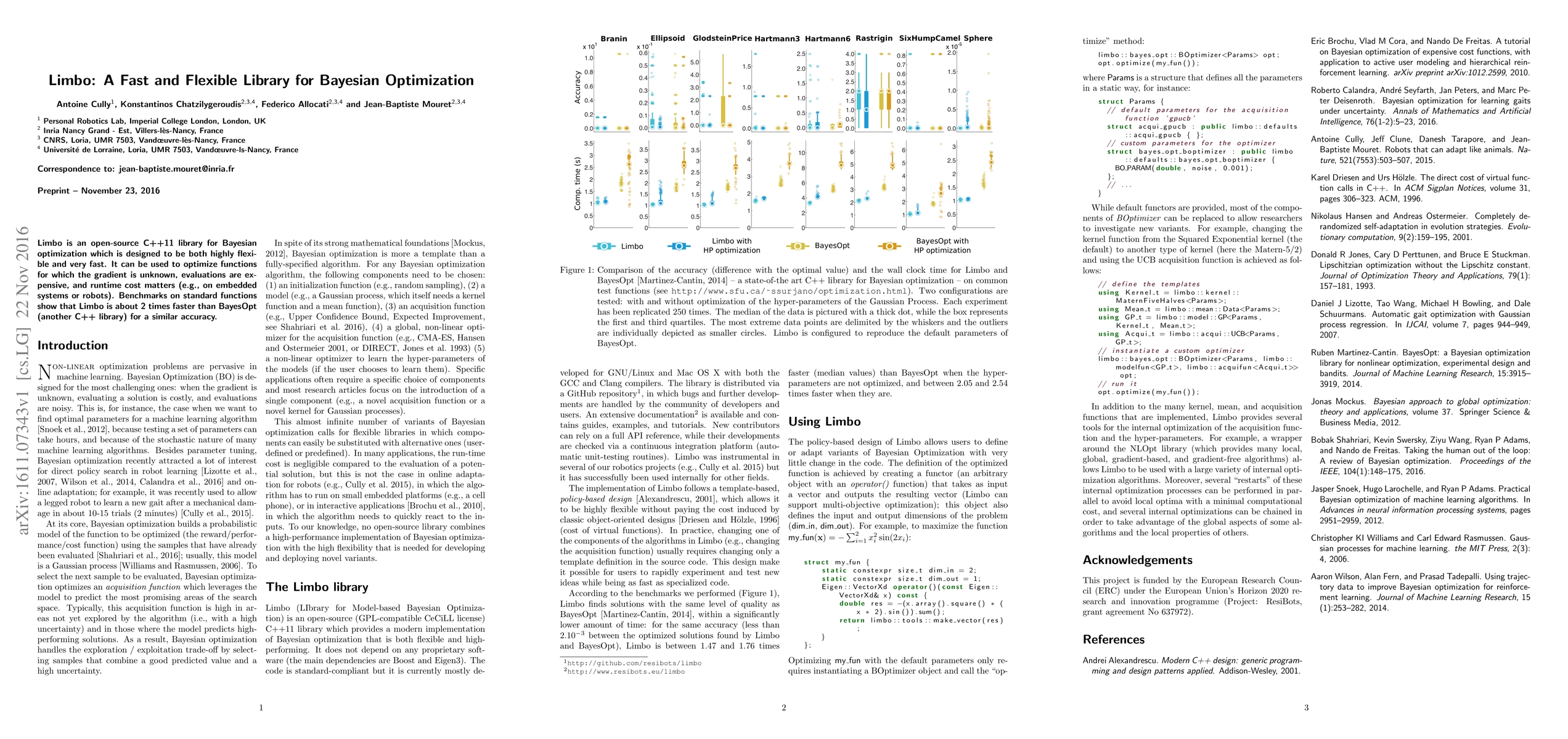Limbo is a fast and flexible C++11 library for Bayesian optimization, designed for scenarios where gradient information is unavailable and evaluation costs are high. Benchmarks indicate it is approximately twice as fast as BayesOpt while maintaining comparable accuracy.