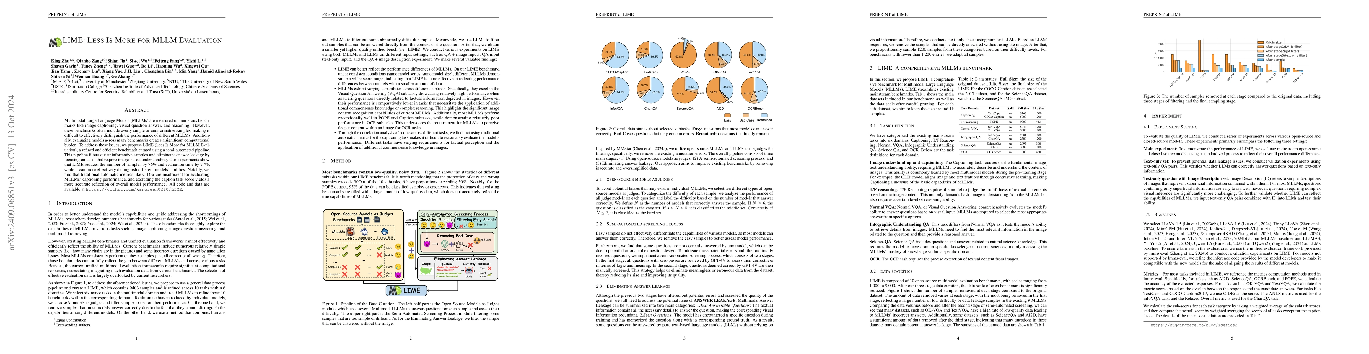 The paper proposes LIME-M, a streamlined benchmark for evaluating Multimodal Large Language Models (MLLMs) by filtering out ineffective and answer-leakage samples, significantly reducing computational burden and better distinguishing model capabilities. The results show LIME-M requires fewer samples and time while providing a more accurate performance assessment.
