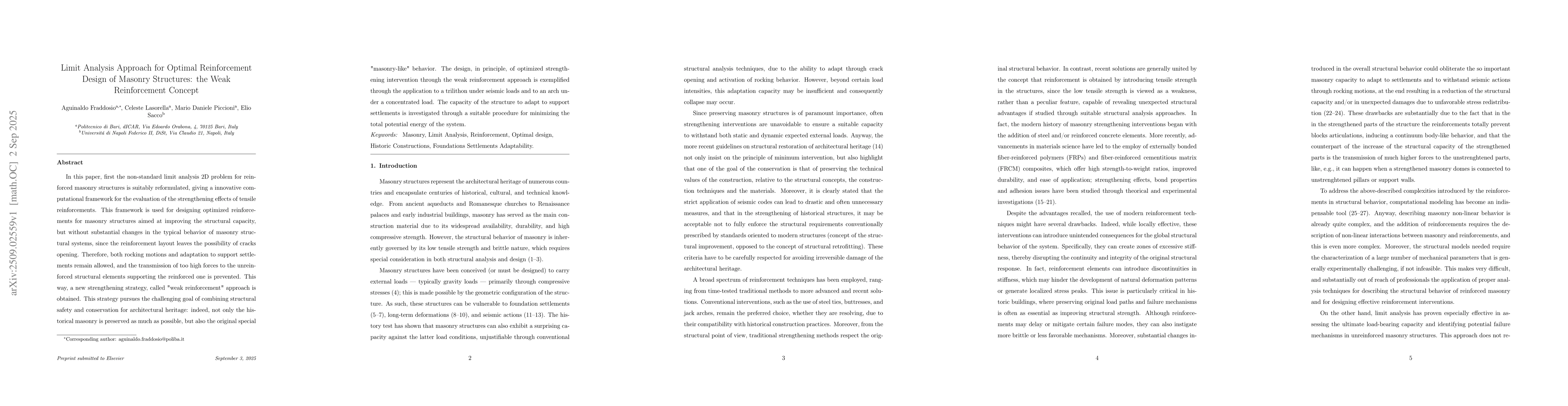 In this paper, first the non-standard limit analysis 2D problem for reinforced masonry structures is suitably reformulated, giving a innovative computational framework for the evaluation of the strengthening effects of tensile reinforcements. This framework is used for designing optimized reinforcements for masonry structures aimed at improving the structural capacity, but without substantial changes in the typical behavior of masonry structural systems, since the reinforcement layout leaves the possibility of cracks opening. Therefore, both rocking motions and adaptation to support settlements remain allowed, and the transmission of too high forces to the unreinforced structural elements supporting the reinforced one is prevented. This way, a new strengthening strategy, called "weak reinforcement" approach is obtained. This strategy pursues the challenging goal of combining structural safety and conservation for architectural heritage: indeed, not only the historical masonry is preserved as much as possible, but also the original special "masonry-like" behavior. The design, in principle, of optimized strengthening intervention through the weak reinforcement approach is exemplified through the application to a trilithon under seismic loads and to an arch under a concentrated load. The capacity of the structure to adapt to support settlements is investigated through a suitable procedure for minimizing the total potential energy of the system.