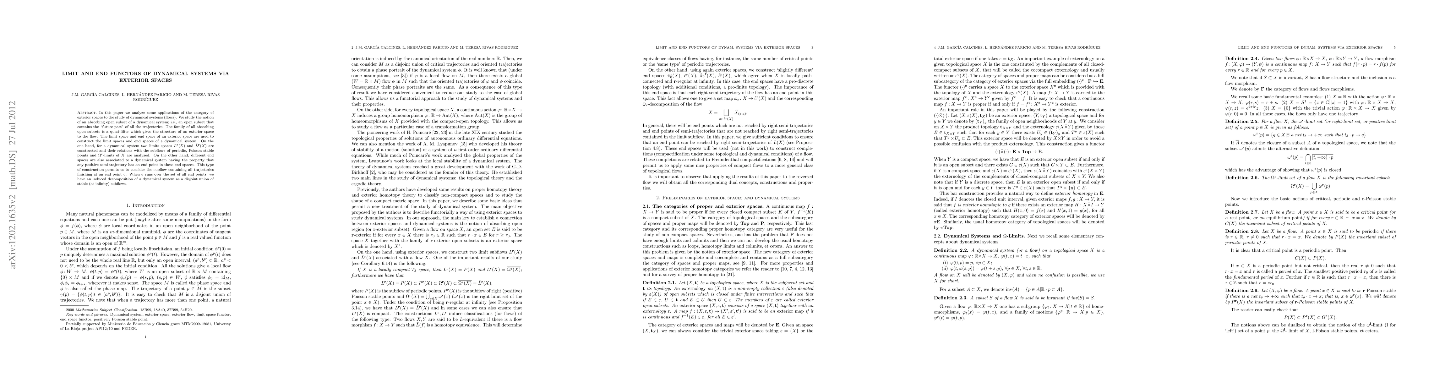 In this paper we analyze some applications of the category of exterior spaces to the study of dynamical systems (flows). We study the notion of an absorbing open subset of a dynamical system; i.e., an open subset that contains the "future part" of all the trajectories. The family of all absorbing open subsets is a quasi-filter which gives the structure of an exterior space to the flow. The limit space and end space of an exterior space is used to construct the limit spaces and end spaces of a dynamical system. On the one hand, for a dynamical system two limits spaces $L^{\r}(X)$ and $\bar L^{\r}(X)$ are constructed and their relations with the subflows of periodic, Poisson stable points and $\Omega^{\r}$-limits of $X$ are analyzed. On the other hand, different end spaces are also associated to a dynamical system having the property that any positive semi-trajectory has an end point in these end spaces. This type of construction permits us to consider the subflow containing all trajectories finishing at an end point $a$. When $a$ runs over the set of all end points, we have an induced decomposition of a dynamical system as a disjoint union of stable (at infinity) subflows.