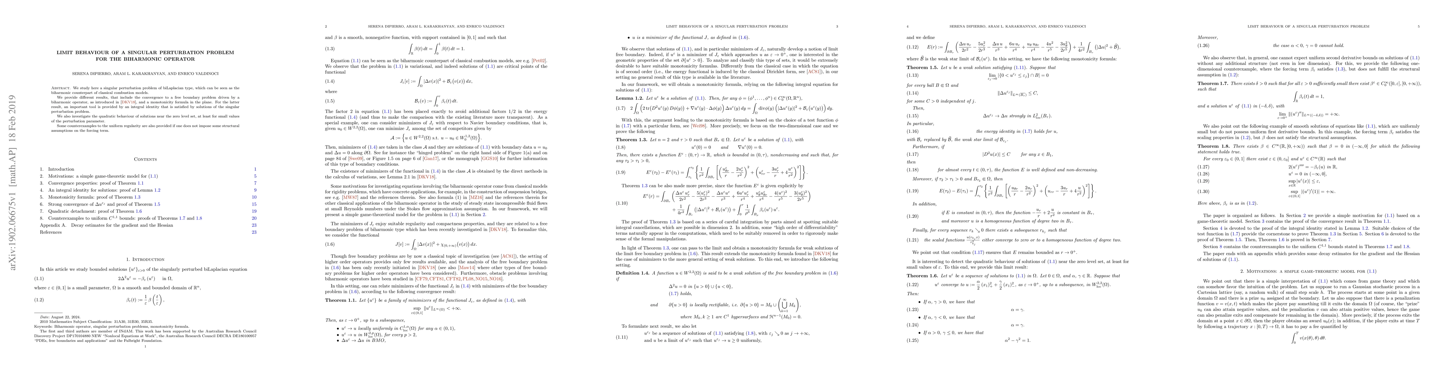 This paper investigates a singular perturbation problem for the biharmonic operator, demonstrating convergence to a free boundary problem and presenting a monotonicity formula in the plane. It also examines the quadratic behavior of solutions near the zero level set and provides counterexamples highlighting the necessity of structural assumptions on the forcing term for uniform regularity.