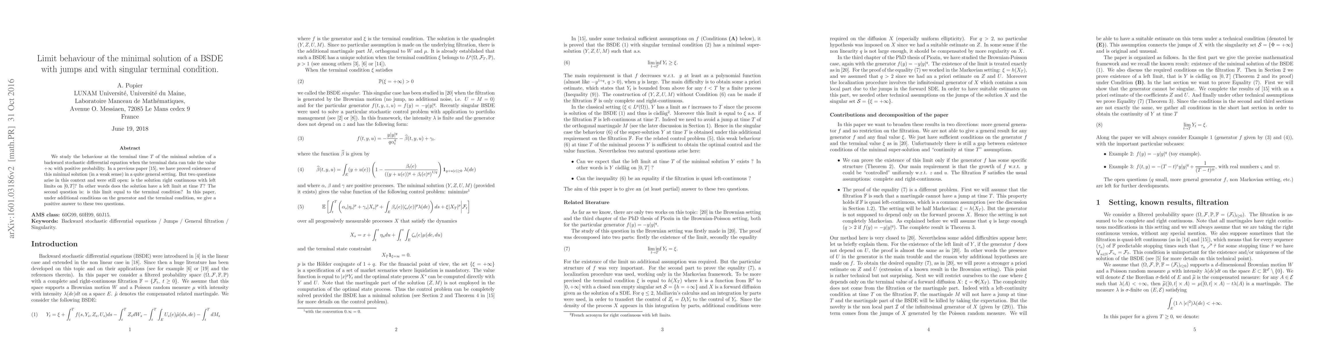 The paper investigates the behavior of a backward stochastic differential equation with jumps and singular terminal conditions at the terminal time T, answering whether the solution has a left limit and equals the terminal condition under certain conditions.