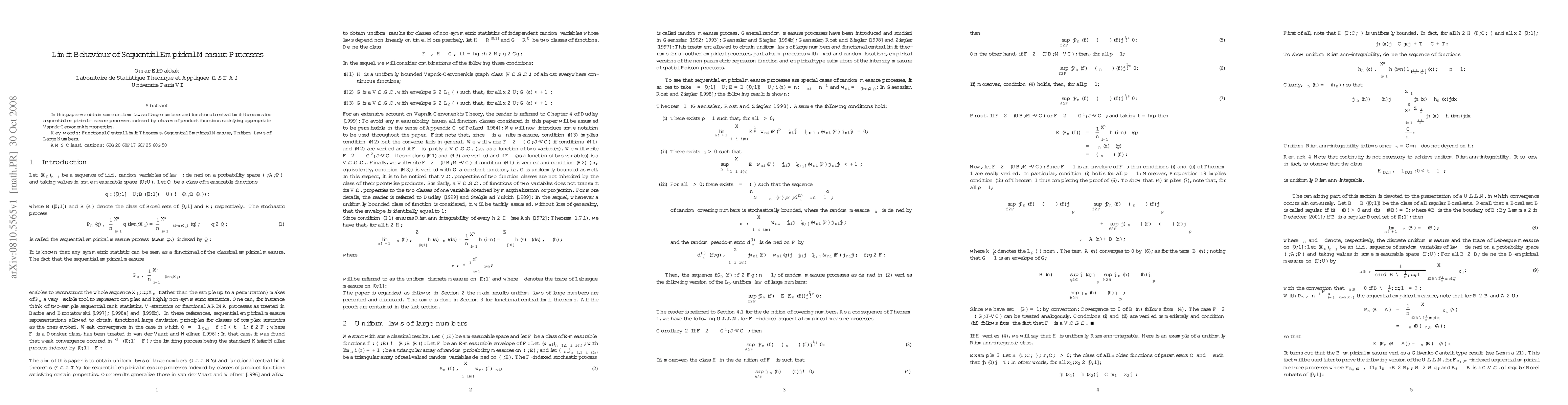 This paper establishes uniform laws of large numbers and functional central limit theorems for sequential empirical measure processes, focusing on classes of product functions with Vapnik-Chervonenkis properties. These results provide a robust framework for understanding the asymptotic behavior of these processes.