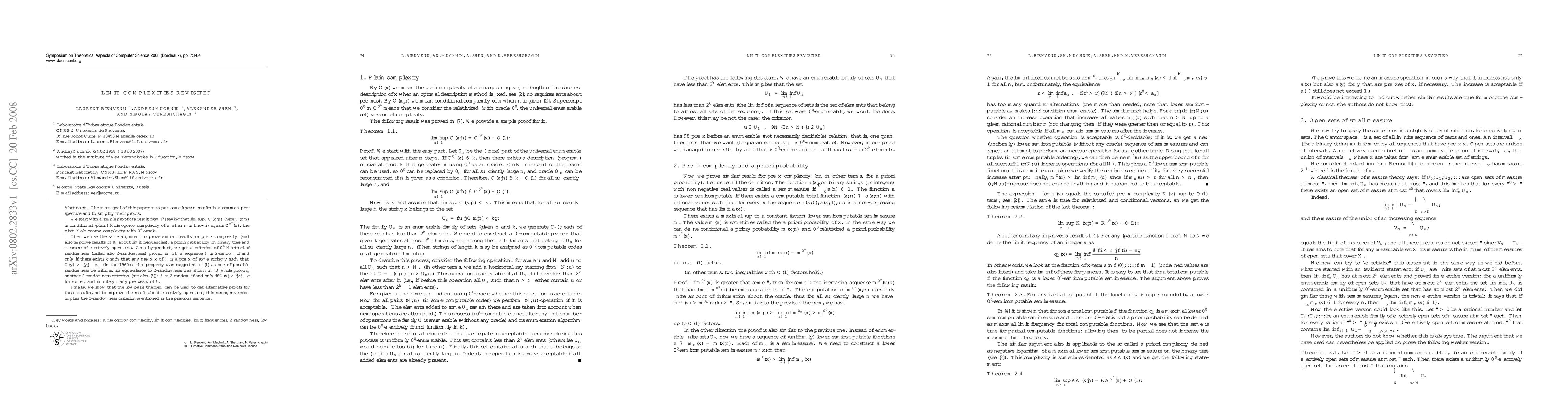 The main goal of this paper is to put some known results in a common perspective and to simplify their proofs. We start with a simple proof of a result from (Vereshchagin, 2002) saying that $\limsup_n\KS(x|n)$ (here $\KS(x|n)$ is conditional (plain) Kolmogorov complexity of $x$ when $n$ is known) equals $\KS^{\mathbf{0'}(x)$, the plain Kolmogorov complexity with $\mathbf{0'$-oracle. Then we use the same argument to prove similar results for prefix complexity (and also improve results of (Muchnik, 1987) about limit frequencies), a priori probability on binary tree and measure of effectively open sets. As a by-product, we get a criterion of $\mathbf{0'}$ Martin-L\"of randomness (called also 2-randomness) proved in (Miller, 2004): a sequence $\omega$ is 2-random if and only if there exists $c$ such that any prefix $x$ of $\omega$ is a prefix of some string $y$ such that $\KS(y)\ge |y|-c$. (In the 1960ies this property was suggested in (Kolmogorov, 1968) as one of possible randomness definitions; its equivalence to 2-randomness was shown in (Miller, 2004) while proving another 2-randomness criterion (see also (Nies et al. 2005)): $\omega$ is 2-random if and only if $\KS(x)\ge |x|-c$ for some $c$ and infinitely many prefixes $x$ of $\omega$. Finally, we show that the low-basis theorem can be used to get alternative proofs for these results and to improve the result about effectively open sets; this stronger version implies the 2-randomness criterion mentioned in the previous sentence.