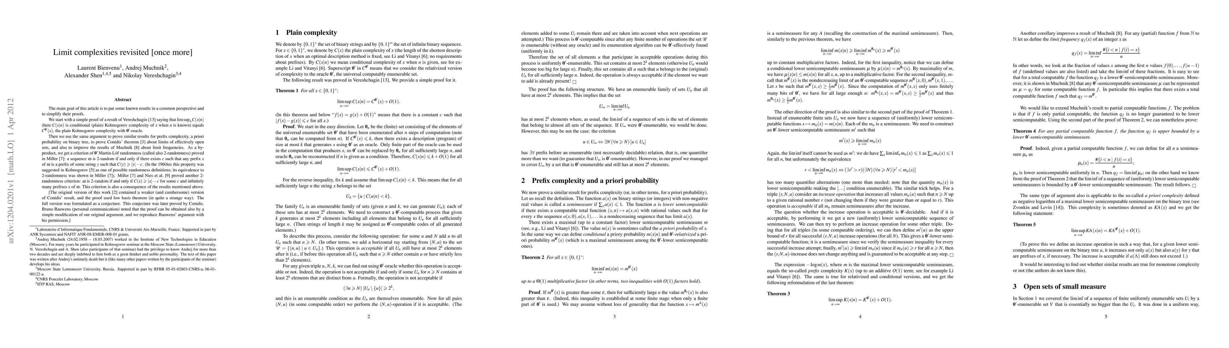 The main goal of this article is to put some known results in a common perspective and to simplify their proofs. We start with a simple proof of a result of Vereshchagin saying that $\limsup_n C(x|n)$ equals $C^{0'}(x)$. Then we use the same argument to prove similar results for prefix complexity, a priori probability on binary tree, to prove Conidis' theorem about limits of effectively open sets, and also to improve the results of Muchnik about limit frequencies. As a by-product, we get a criterion of 2-randomness proved by Miller: a sequence $X$ is 2-random if and only if there exists $c$ such that any prefix $x$ of $X$ is a prefix of some string $y$ such that $C(y)\ge |y|-c$. (In the 1960ies this property was suggested in Kolmogorov as one of possible randomness definitions.) We also get another 2-randomness criterion by Miller and Nies: $X$ is 2-random if and only if $C(x)\ge |x|-c$ for some $c$ and infinitely many prefixes $x$ of $X$. This is a modified version of our old paper that contained a weaker (and cumbersome) version of Conidis' result, and the proof used low basis theorem (in quite a strange way). The full version was formulated there as a conjecture. This conjecture was later proved by Conidis. Bruno Bauwens (personal communication) noted that the proof can be obtained also by a simple modification of our original argument, and we reproduce Bauwens' argument with his permission.