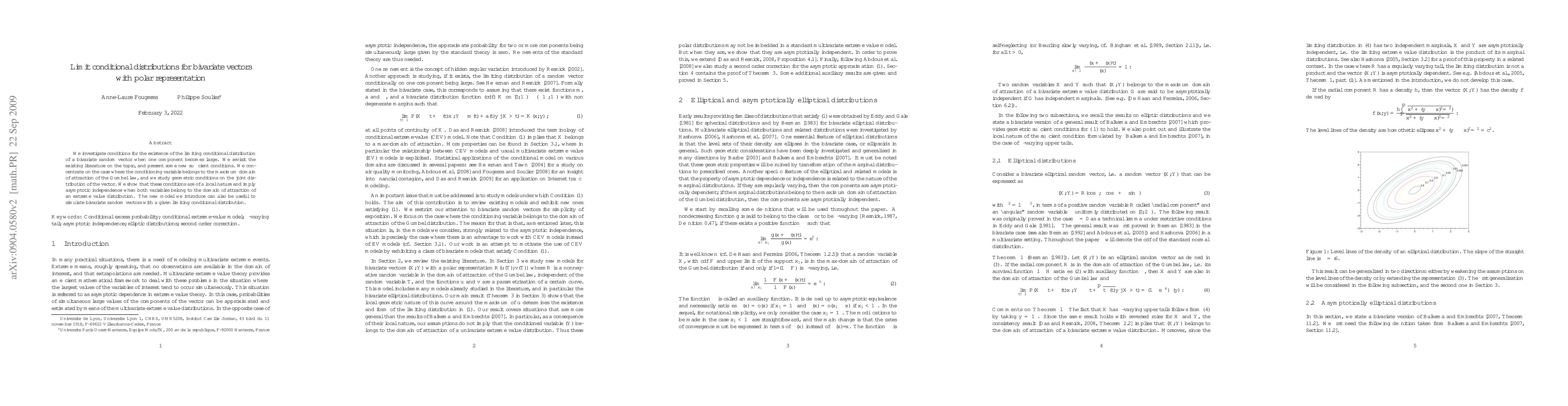 We investigate conditions for the existence of the limiting conditional distribution of a bivariate random vector when one component becomes large. We revisit the existing literature on the topic, and present some new sufficient conditions. We concentrate on the case where the conditioning variable belongs to the maximum domain of attraction of the Gumbel law, and we study geometric conditions on the joint distribution of the vector. We show that these conditions are of a local nature and imply asymptotic independence when both variables belong to the domain of attraction of an extreme value distribution. The new model we introduce can also be useful for simulations.