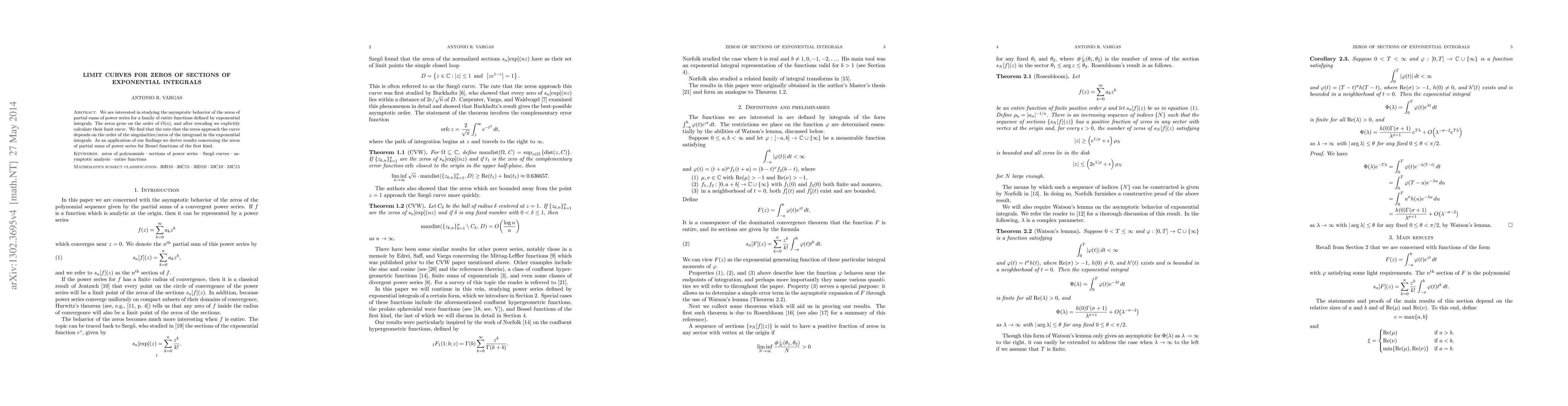 We are interested in studying the asymptotic behavior of the zeros of partial sums of power series for a family of entire functions defined by exponential integrals. The zeros grow on the order of O(n), and after rescaling we explicitly calculate their limit curve. We find that the rate that the zeros approach the curve depends on the order of the singularities/zeros of the integrand in the exponential integrals. As an application of our findings we derive results concerning the zeros of partial sums of power series for Bessel functions of the first kind.