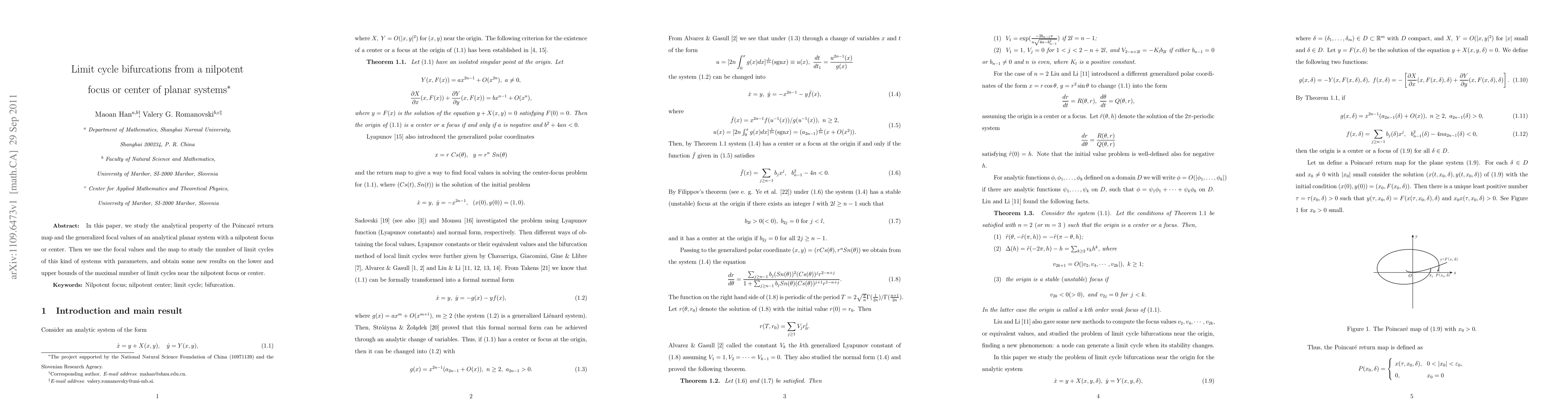 This paper investigates the analytical properties of the Poincaré return map and generalized focal values for planar systems with a nilpotent focus or center, and uses these to determine the number of limit cycles, establishing new bounds for the maximum number of such cycles.