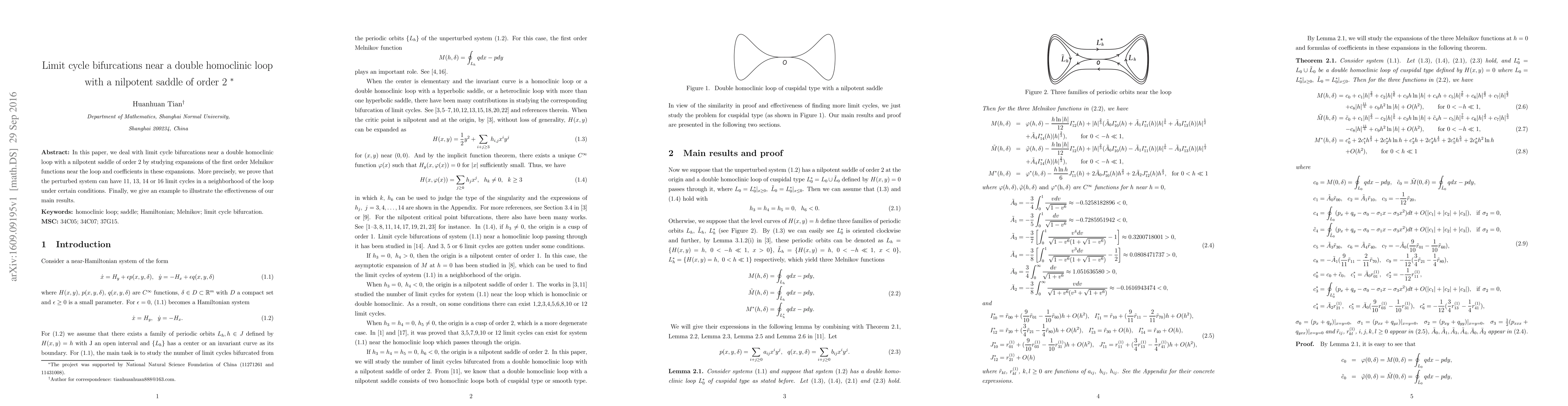 This research investigates limit cycle bifurcations near a double homoclinic loop with a nilpotent saddle of order 2, demonstrating that the system can exhibit 11, 13, 14, or 16 limit cycles under specific conditions, using Melnikov function expansions. An example is provided to demonstrate the practical application of the findings.