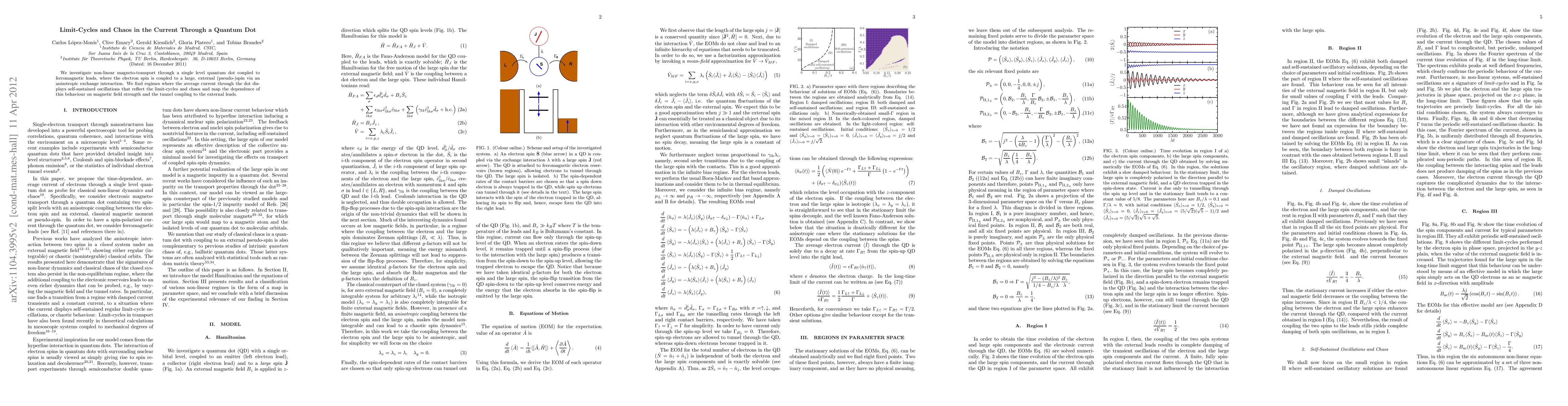 We investigate non-linear magneto-transport through a single level quantum dot coupled to ferromagnetic leads, where the electron spin is coupled to a large, external (pseudo)spin via an anisotropic exchange interaction. We find regimes where the average current through the dot displays self-sustained oscillations that reflect the limit-cycles and chaos and map the dependence of this behaviour on magnetic field strength and the tunnel coupling to the external leads.