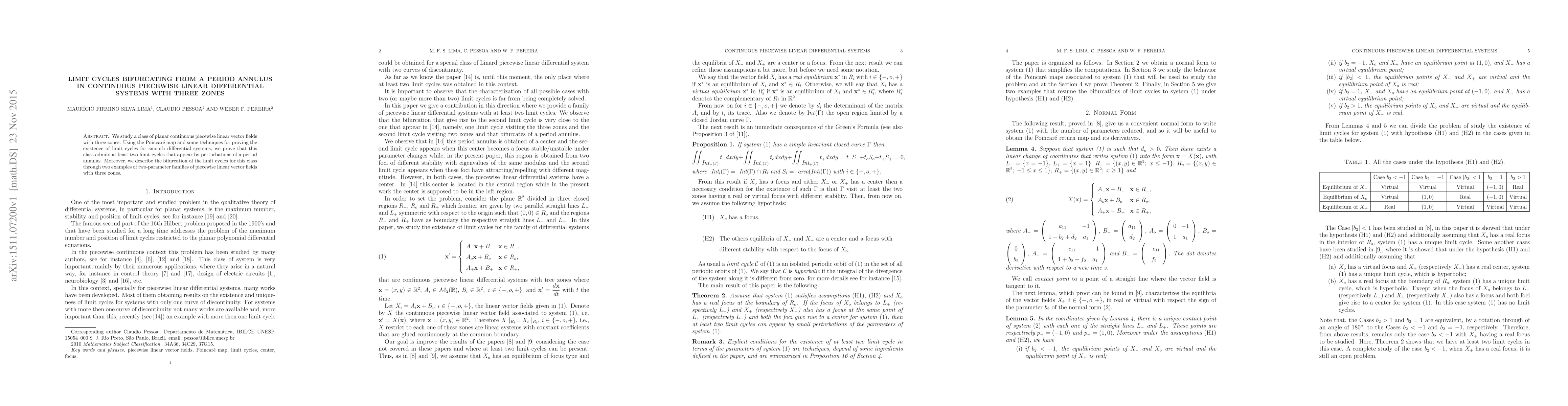 This paper investigates planar continuous piecewise linear systems with three zones, proving the existence of at least two limit cycles arising from perturbations of a period annulus using the Poincaré map. It also demonstrates the bifurcation of these limit cycles through two examples of two-parameter families of piecewise linear vector fields.