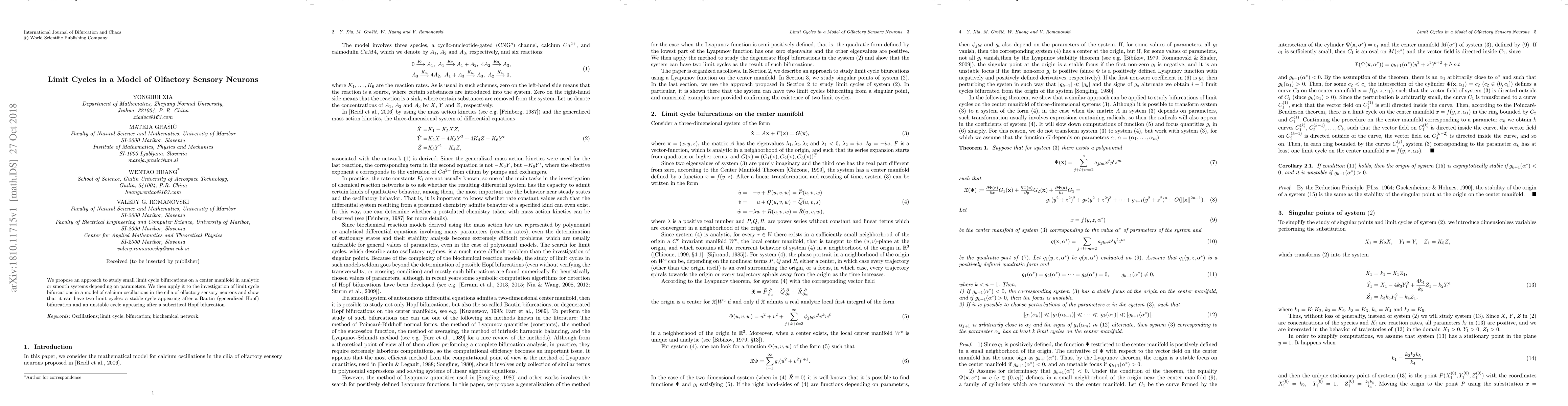 Researchers studied limit cycle bifurcations in a model of olfactory sensory neurons and found that it can have two types of cycles: stable and unstable, triggered by different types of bifurcations.