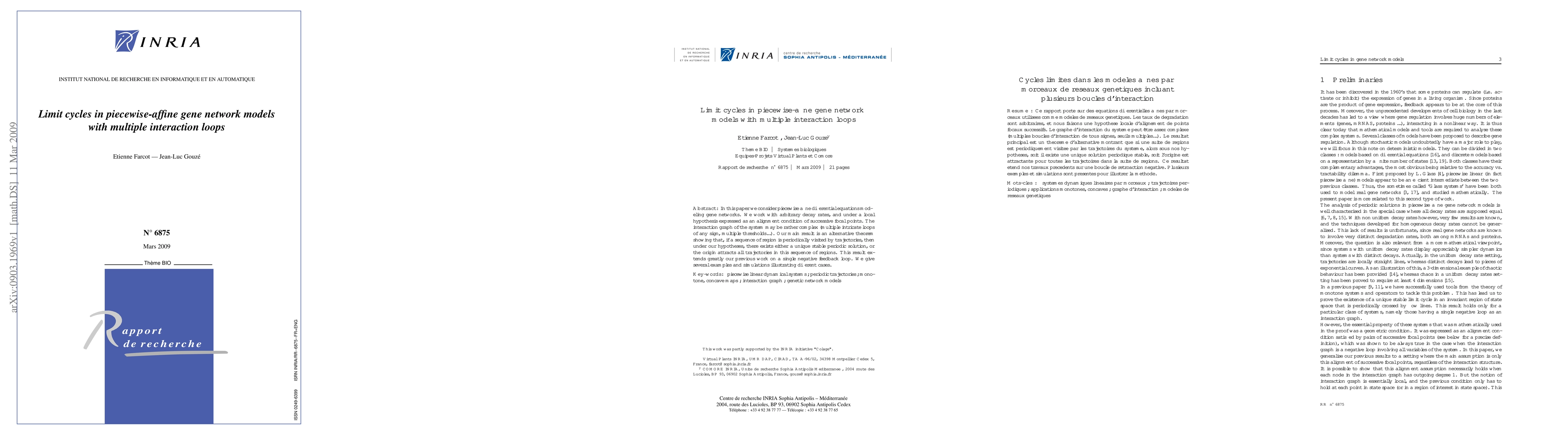 In this paper we consider piecewise affine differential equations modeling gene networks. We work with arbitrary decay rates, and under a local hypothesis expressed as an alignment condition of successive focal points. The interaction graph of the system may be rather complex (multiple intricate loops of any sign, multiple thresholds...). Our main result is an alternative theorem showing that, if a sequence of region is periodically visited by trajectories, then under our hypotheses, there exists either a unique stable periodic solution, or the origin attracts all trajectories in this sequence of regions. This result extends greatly our previous work on a single negative feedback loop. We give several examples and simulations illustrating different cases.