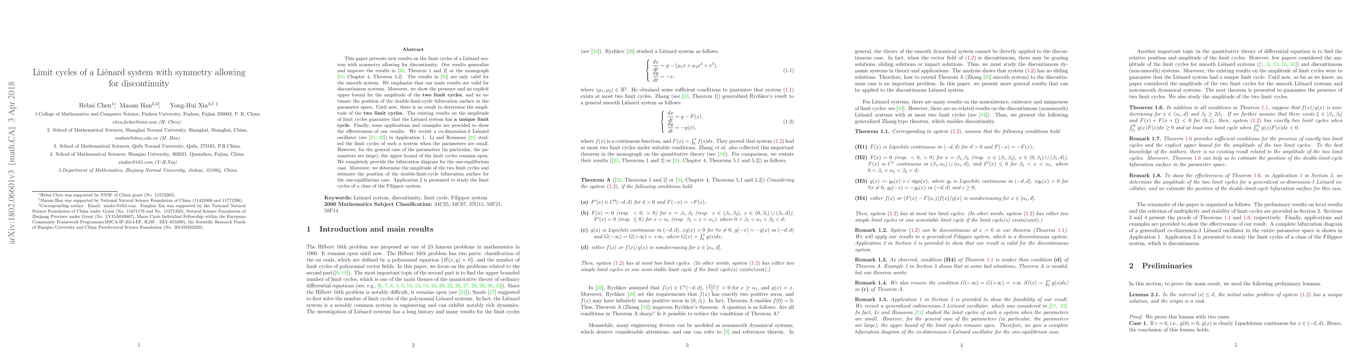 This paper presents new results on the limit cycles of a Li\'enard system with symmetry allowing for discontinuity. Our results generalize and improve the results in [33,34]. The results in [34] are only valid for the smooth system. We emphasize that our main results are valid for discontinuous systems. Moreover, we show the presence and an explicit upper bound for the amplitude of the two limit cycles, and we estimate the position of the double-limit-cycle bifurcation surface in the parameter space. Until now, there is no result to determine the amplitude of the two limit cycles. The existing results on the amplitude of limit cycles guarantee that the Li\'enard system has a unique limit cycle. Finally, some applications and examples are provided to show the effectiveness of our results. We revisit a co-dimension-3 Li\'enard oscillator (see [21,32]) in Application 1. Li and Rousseau [21] studied the limit cycles of such a system when the parameters are small. However, for the general case of the parameters (in particular, the parameters are large), the upper bound of the limit cycles remains open. We completely provide the bifurcation diagram for the one-equilibrium case. Moreover, we determine the amplitude of the two limit cycles and estimate the position of the double-limit-cycle bifurcation surface for the one-equilibrium case. Application 2 is presented to study the limit cycles of a class of the Filippov system.
