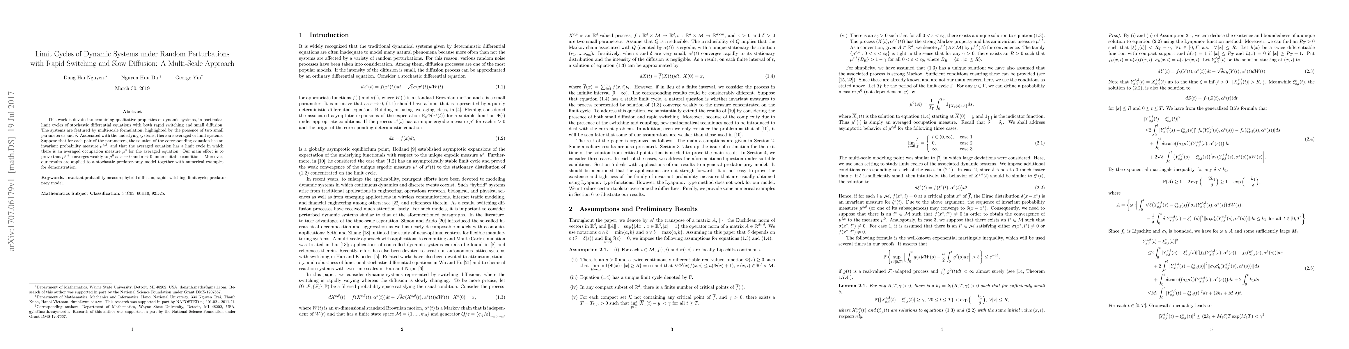 This work is devoted to examining qualitative properties of dynamic systems, in particular, limit cycles of stochastic differential equations with both rapid switching and small diffusion. The systems are featured by multi-scale formulation, highlighted by the presence of two small parameters $\epsilon$ and $\delta$. Associated with the underlying systems, there are averaged or limit systems. Suppose that for each pair of the parameters, the solution of the corresponding equation has an invariant probability measure $\mu^{\epsilon,\delta}$, and that the averaged equation has a limit cycle in which there is an averaged occupation measure $\mu^0$ for the averaged equation. Our main effort is to prove that $\mu^{\epsilon,\delta}$ converges weakly to $\mu^0$ as $\epsilon \to 0$ and $\delta \to 0$ under suitable conditions. Moreover, our results are applied to a stochastic predator-prey model together with numerical examples for demonstration.