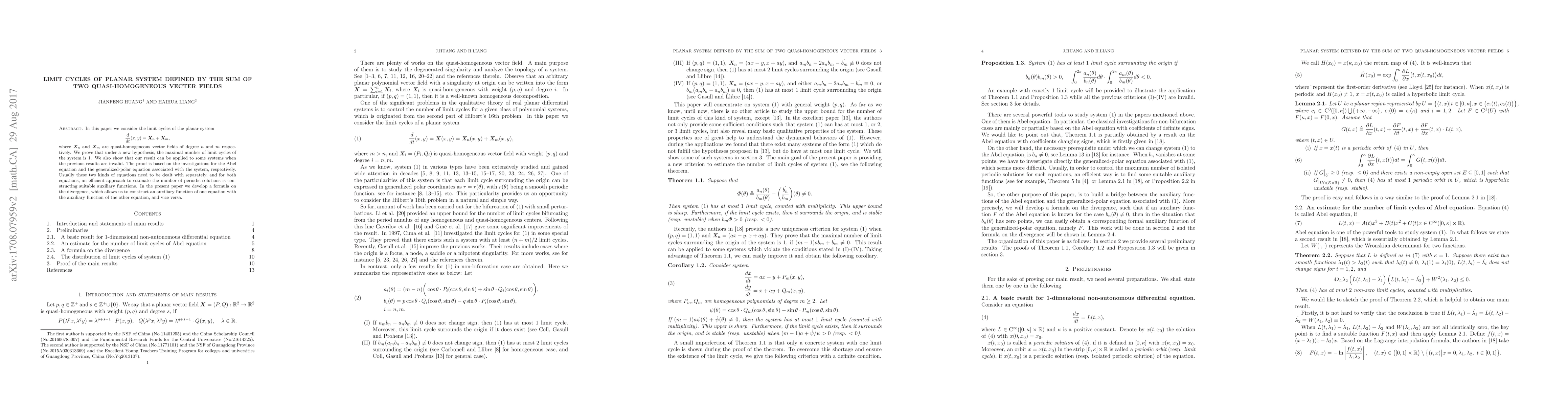 In this paper we consider the limit cycles of the planar system $$\frac{d}{dt}(x,y)=\mathbf X_n+\mathbf X_m, $$ where $\mathbf X_n$ and $\mathbf X_m$ are quasi-homogeneous vector fields of degree $n$ and $m$ respectively. We prove that under a new hypothesis, the maximal number of limit cycles of the system is $1$. We also show that our result can be applied to some systems when the previous results are invalid. The proof is based on the investigations for the Abel equation and the generalized-polar equation associated with the system, respectively. Usually these two kinds of equations need to be dealt with separately, and for both equations, an efficient approach to estimate the number of periodic solutions is constructing suitable auxiliary functions. In the present paper we develop a formula on the divergence, which allows us to construct an auxiliary function of one equation with the auxiliary function of the other equation, and vice versa.
