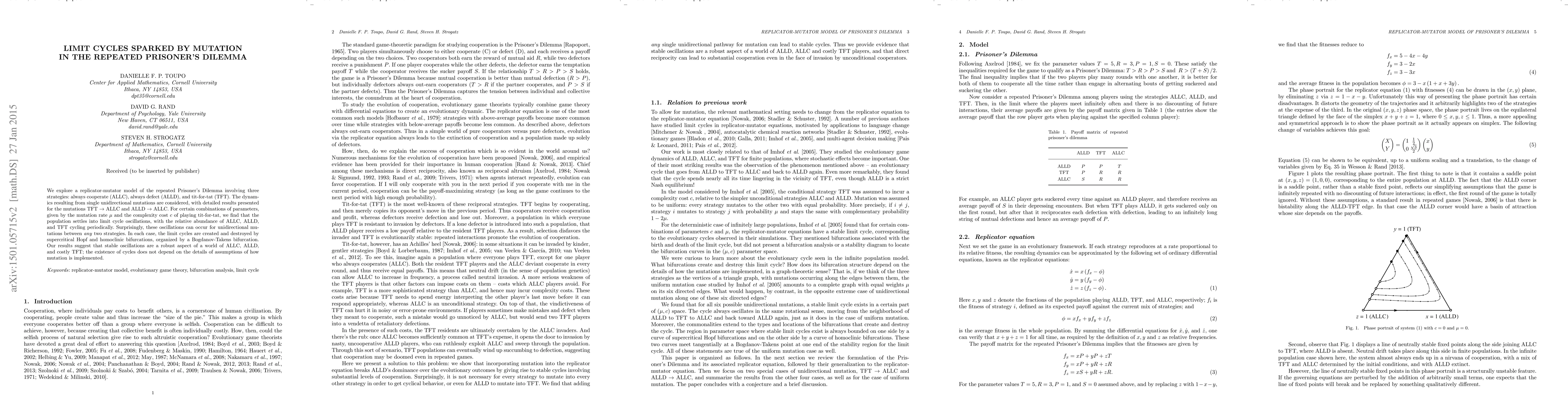 We explore a replicator-mutator model of the repeated Prisoner's Dilemma involving three strategies: always cooperate (ALLC), always defect (ALLD), and tit-for-tat (TFT). The dynamics resulting from single unidirectional mutations are considered, with detailed results presented for the mutations TFT $\rightarrow$ ALLC and ALLD $\rightarrow$ ALLC. For certain combinations of parameters, given by the mutation rate $\mu$ and the complexity cost $c$ of playing tit-for-tat, we find that the population settles into limit cycle oscillations, with the relative abundance of ALLC, ALLD, and TFT cycling periodically. Surprisingly, these oscillations can occur for unidirectional mutations between any two strategies. In each case, the limit cycles are created and destroyed by supercritical Hopf and homoclinic bifurcations, organized by a Bogdanov-Takens bifurcation. Our results suggest that stable oscillations are a robust aspect of a world of ALLC, ALLD, and costly TFT; the existence of cycles does not depend on the details of assumptions of how mutation is implemented.