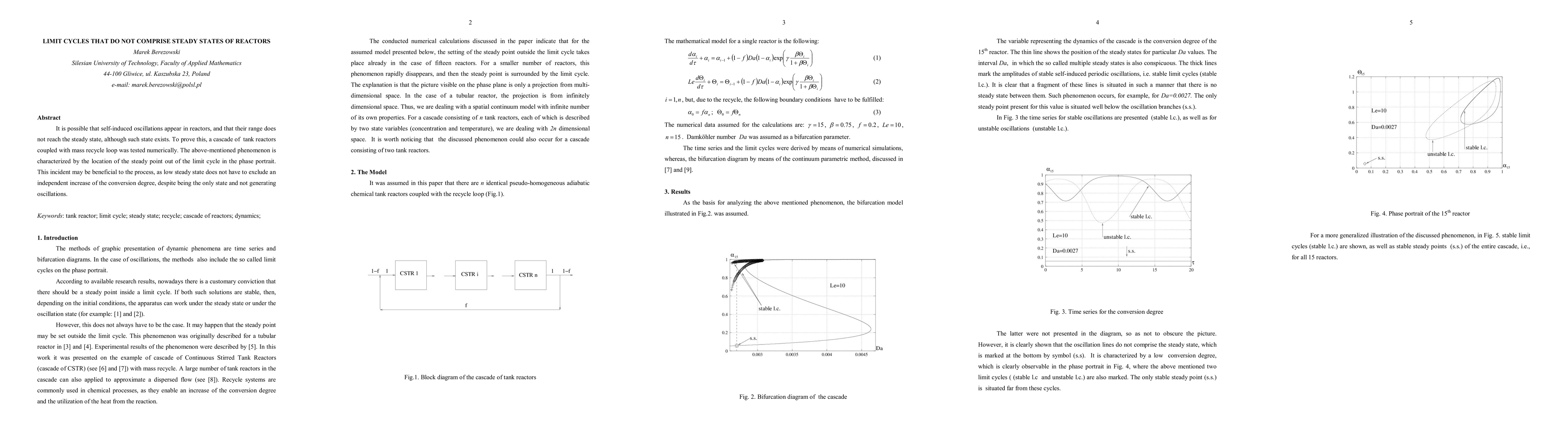 It is possible that self-induced oscillations appear in reactors, and that their range does not reach the steady state, although such state exists. To prove this, a cascade of tank reactors coupled with mass recycle loop was tested numerically. The above-mentioned phenomenon is characterized by the location of the steady point out of the limit cycle in the phase portrait. This incident may be beneficial to the process, as low steady state does not have to exclude an independent increase of the conversion degree, despite being the only state and not generating oscillations.