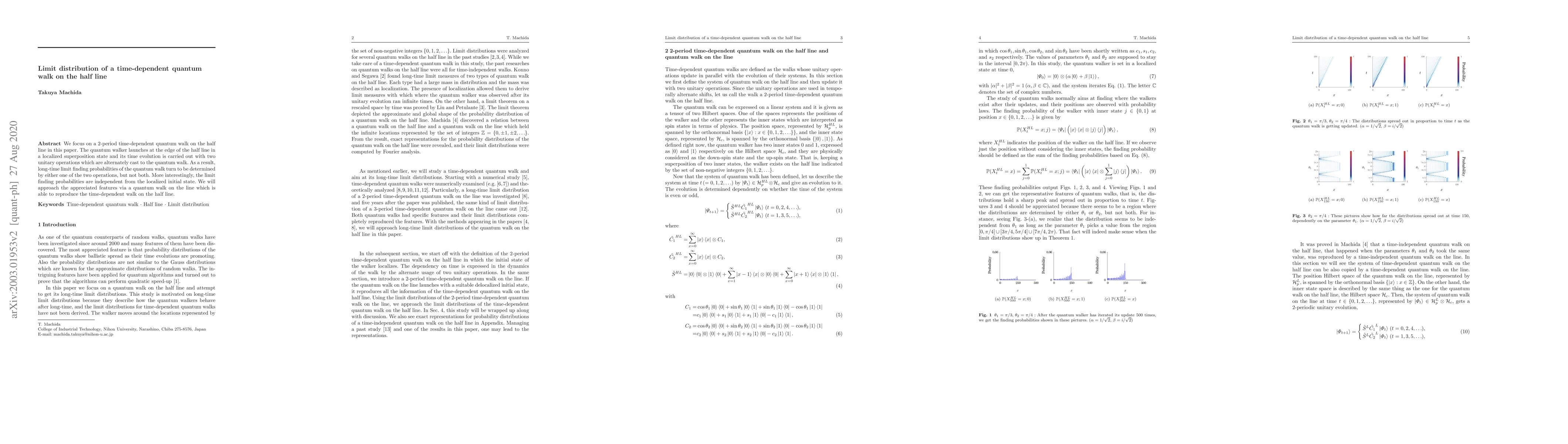 This paper investigates a 2-period time-dependent quantum walk on the half line, revealing that long-time limit finding probabilities are determined by one of the two unitary operations and are independent of the initial state. The study uses a quantum walk on the line to reproduce and understand these features.