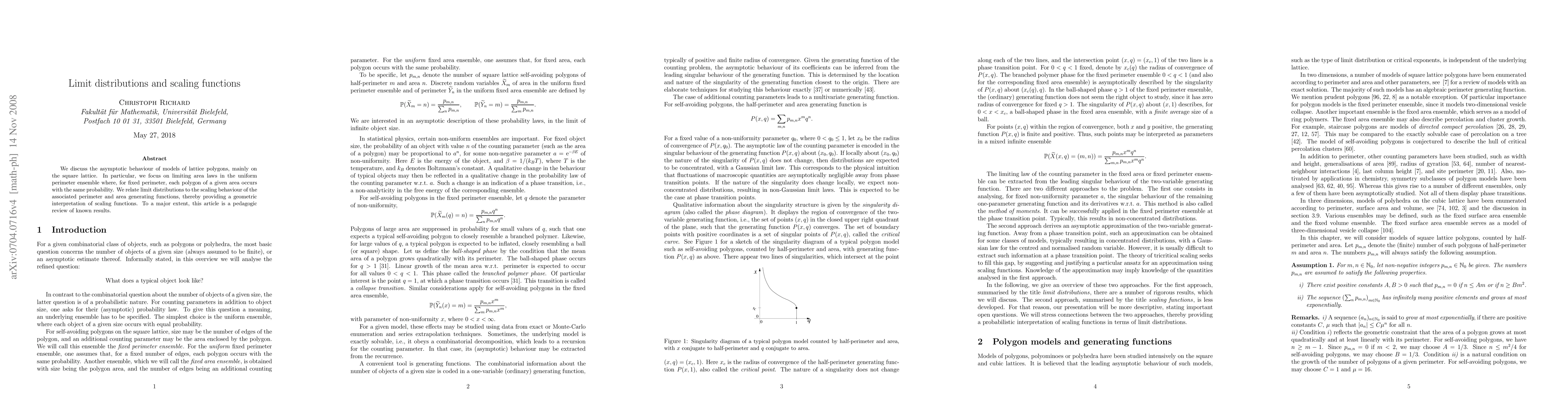 We discuss the asymptotic behaviour of models of lattice polygons, mainly on the square lattice. In particular, we focus on limiting area laws in the uniform perimeter ensemble where, for fixed perimeter, each polygon of a given area occurs with the same probability. We relate limit distributions to the scaling behaviour of the associated perimeter and area generating functions, thereby providing a geometric interpretation of scaling functions. To a major extent, this article is a pedagogic review of known results.