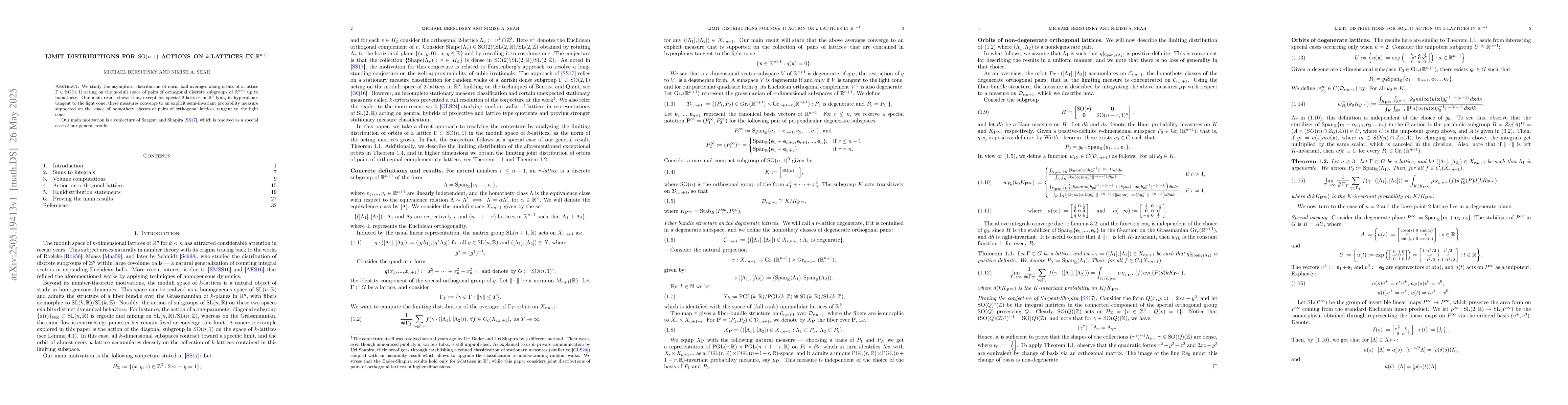 The paper presents a detailed analysis of the limit distributions for the SO(n,1) action on k-lattices, providing an explicit semi-invariant probability measure as a solution.