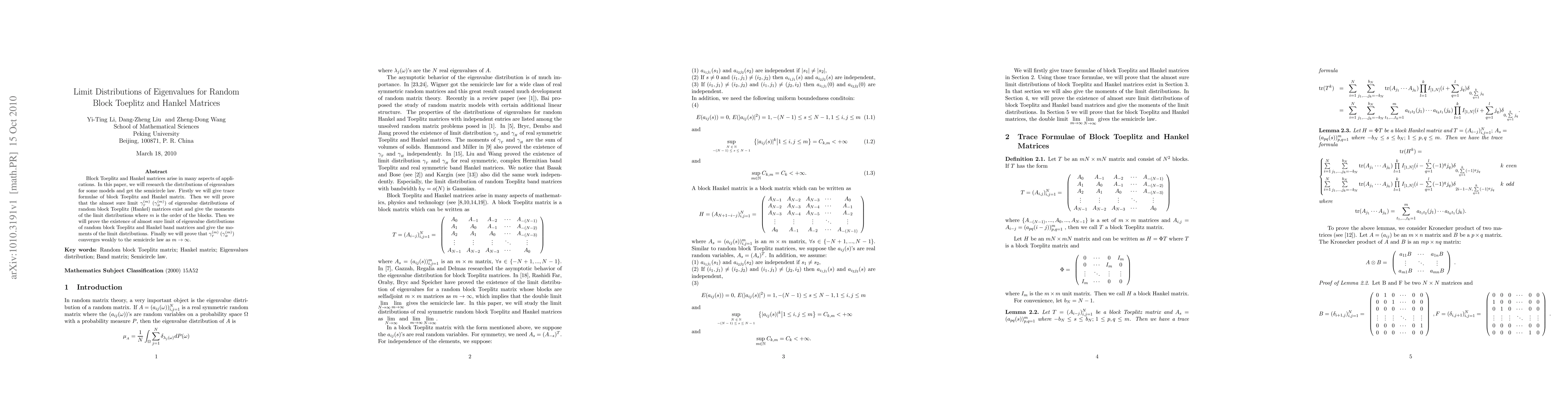 Block Toeplitz and Hankel matrices arise in many aspects of applications. In this paper, we will research the distributions of eigenvalues for some models and get the semicircle law. Firstly we will give trace formulae of block Toeplitz and Hankel matrix. Then we will prove that the almost sure limit $\gamma_{_T}^{(m)}$ $(\gamma_{_H}^{(m)})$ of eigenvalue distributions of random block Toeplitz (Hankel) matrices exist and give the moments of the limit distributions where $m$ is the order of the blocks. Then we will prove the existence of almost sure limit of eigenvalue distributions of random block Toeplitz and Hankel band matrices and give the moments of the limit distributions. Finally we will prove that $\gamma_{_T}^{(m)}$ $(\gamma_{_H}^{(m)})$ converges weakly to the semicircle law as $m\ra\iy$.